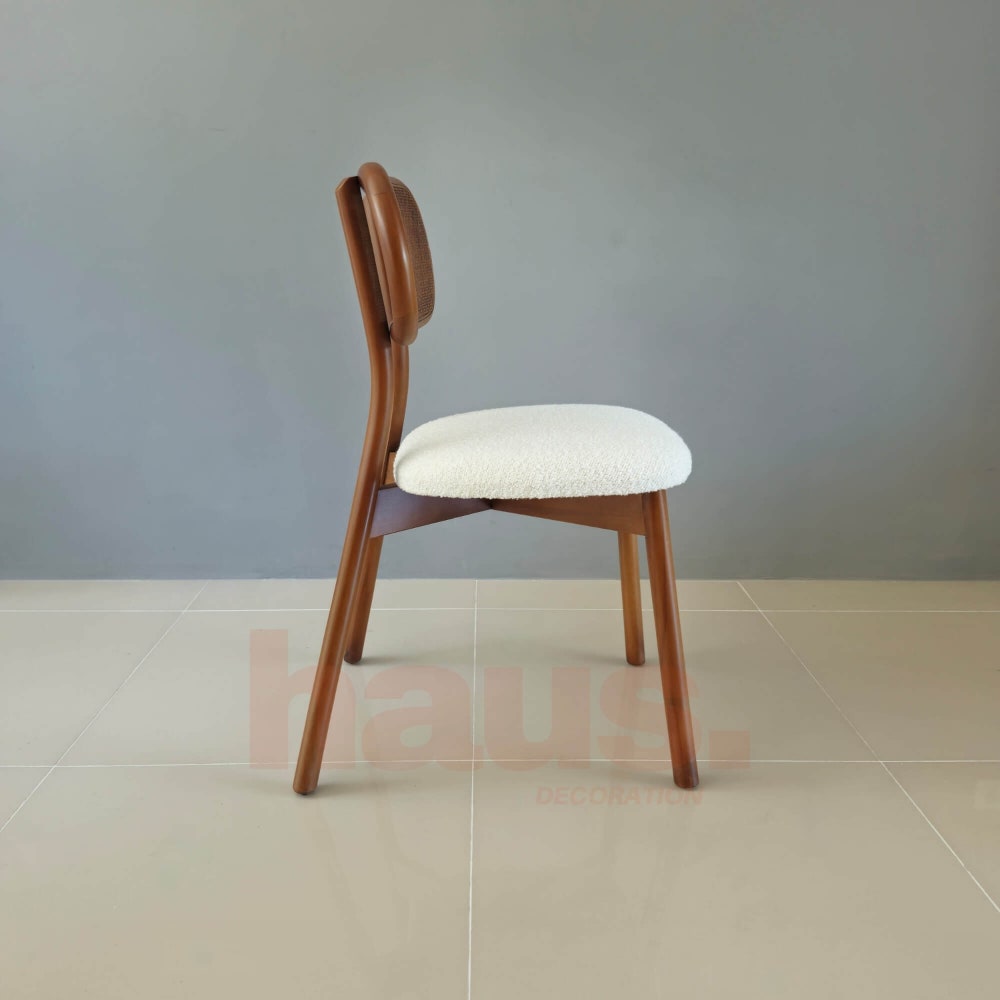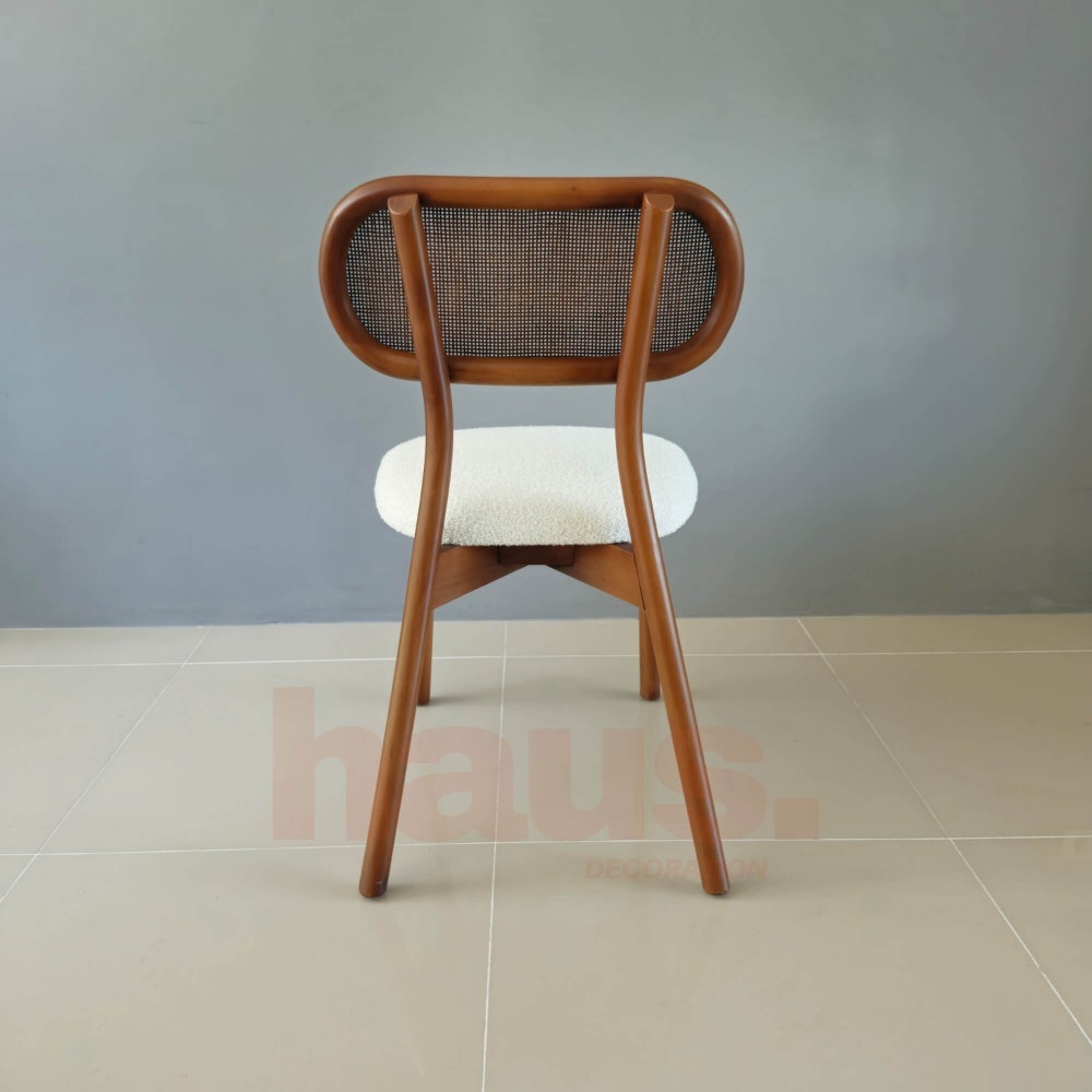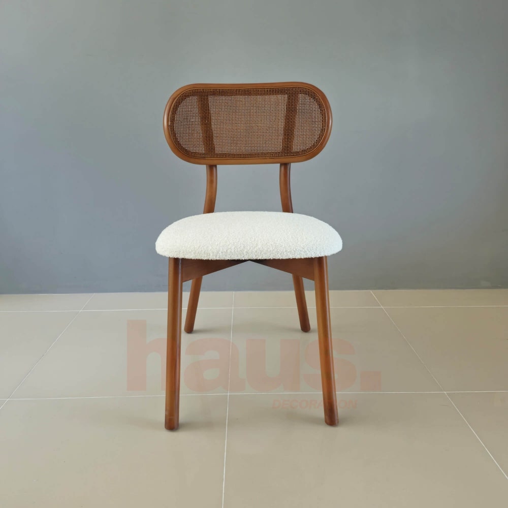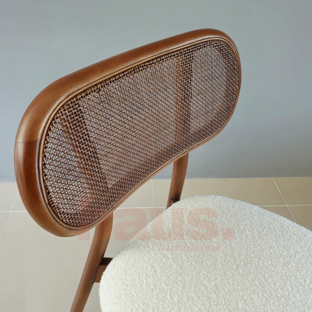 This wooden chair is inspired by mid-century design, showcasing a natural hornbeam wood frame and natural rattan details. The soft teddy seat adds a touch of sophistication while providing lasting comfort. Ideal for dining, working, or relaxing, this chair fits any setting and is “fully customizable” to suit your preferences. Choose your finish, fabric, or even adjust the dimensions, because at Haus Decoration we create furniture that fits you.