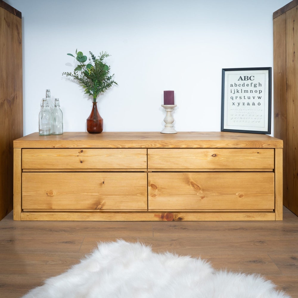 Introducing our Solid Wood Low Chest of Drawers, meticulously crafted to blend functionality with timeless elegance. Ideal for organizing your bedroom essentials, this piece features a thoughtful design that enhances both style and practicality. Includes a large solid wood top surface, perfect for displaying decorative items, or keeping everyday necessities within reach. Smooth-gliding drawers offer discreet storage for personal items, keeping your space clutter-free.