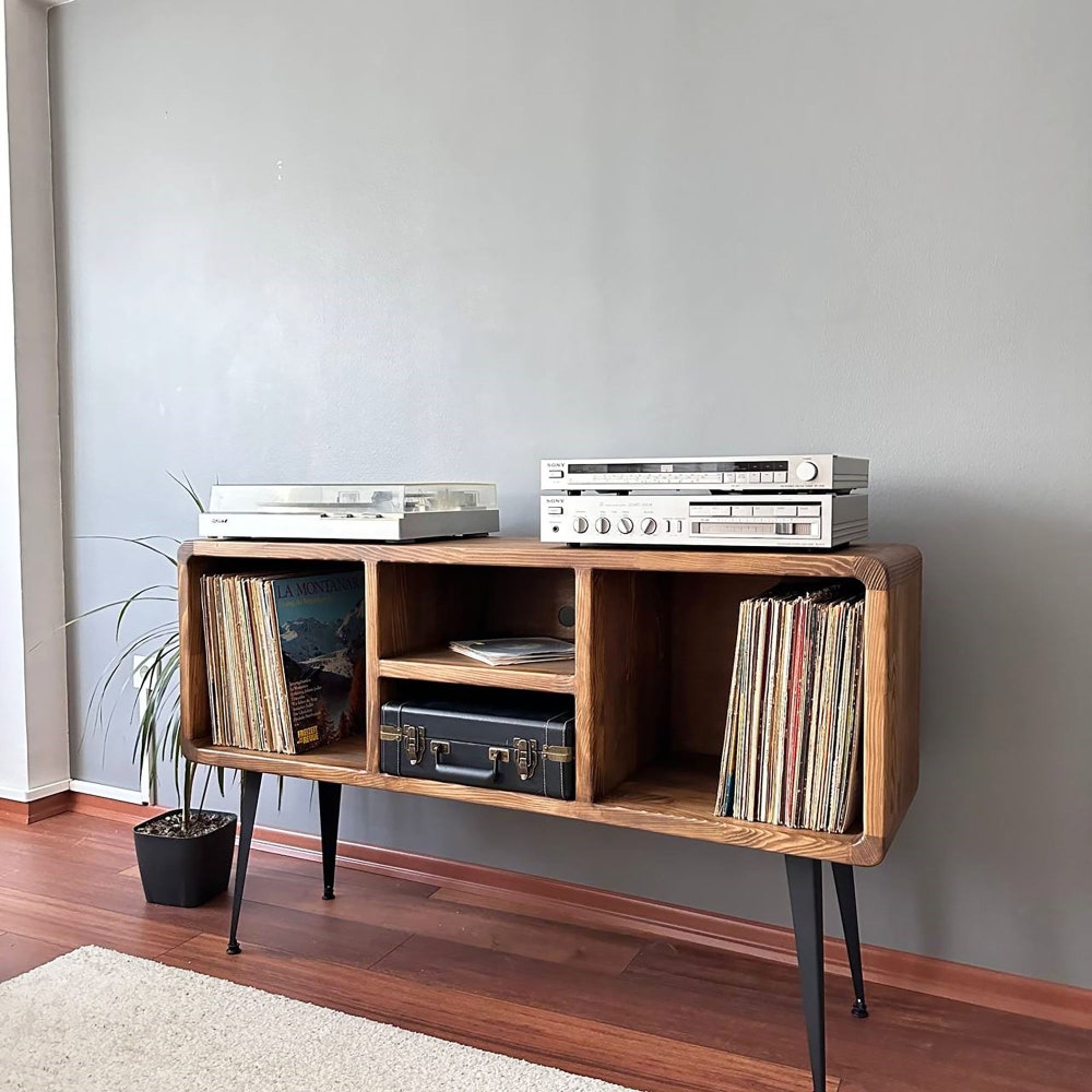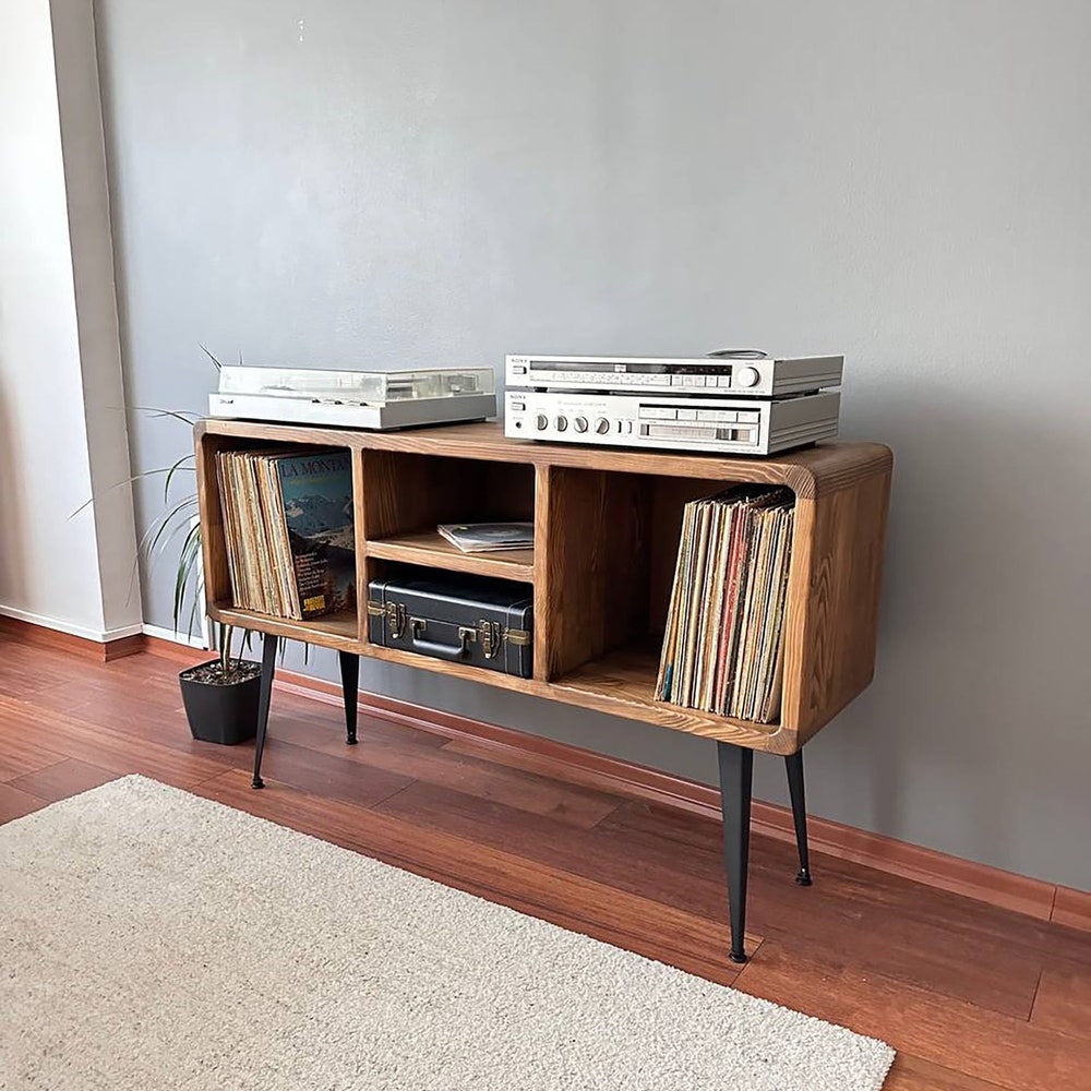 Real Wood Customizable Turntable Stand. With an album capacity of 150-310 LPs, this multimedia cabinet is perfect for music lovers who want to keep their records safe, organized and easily accessible.