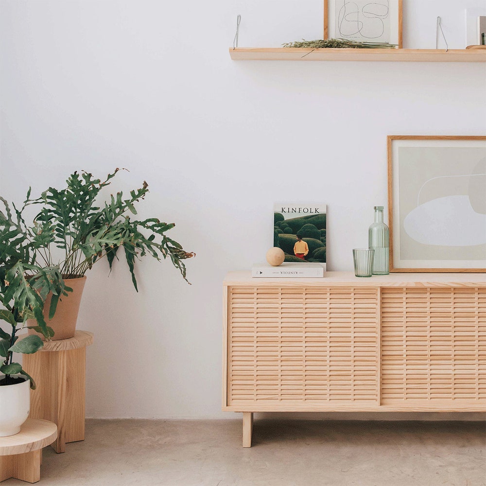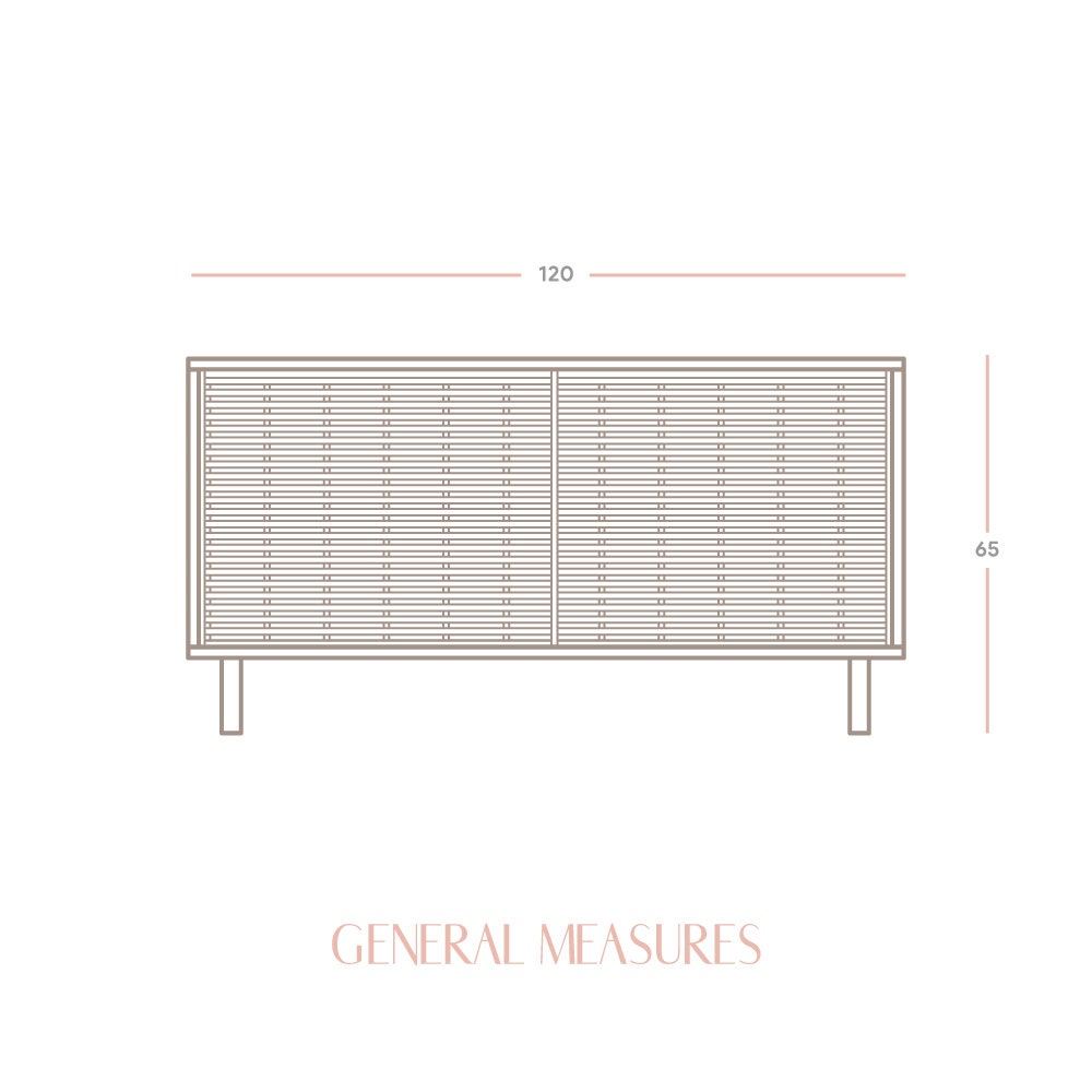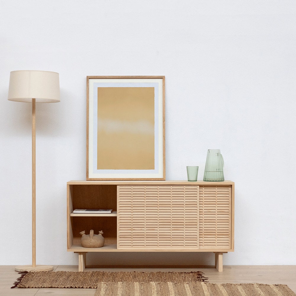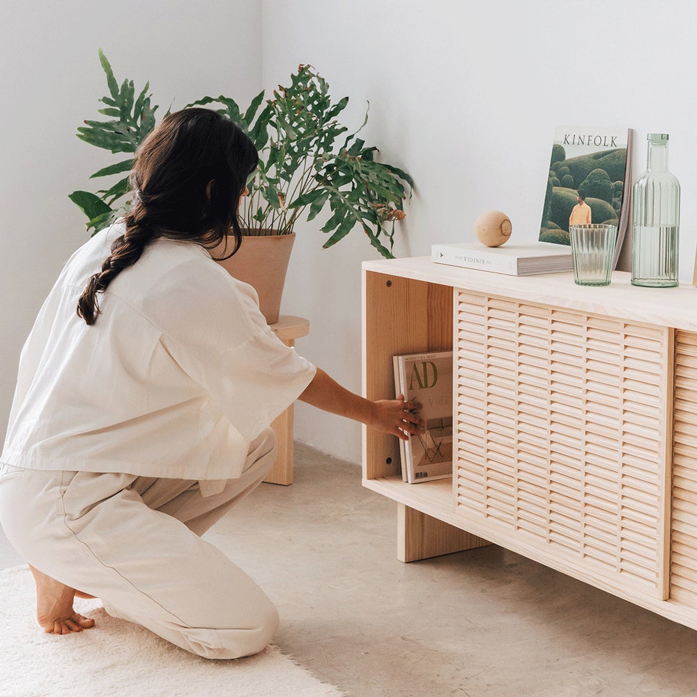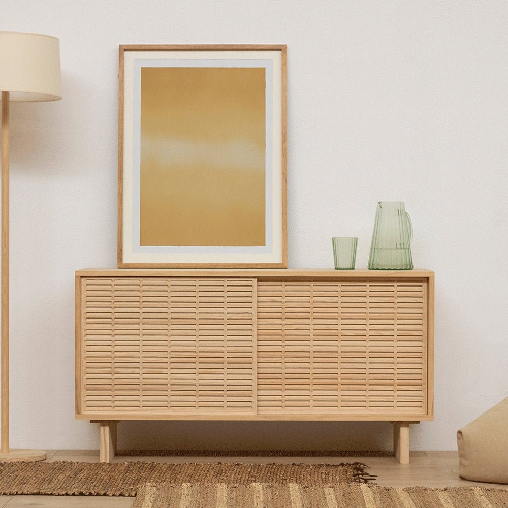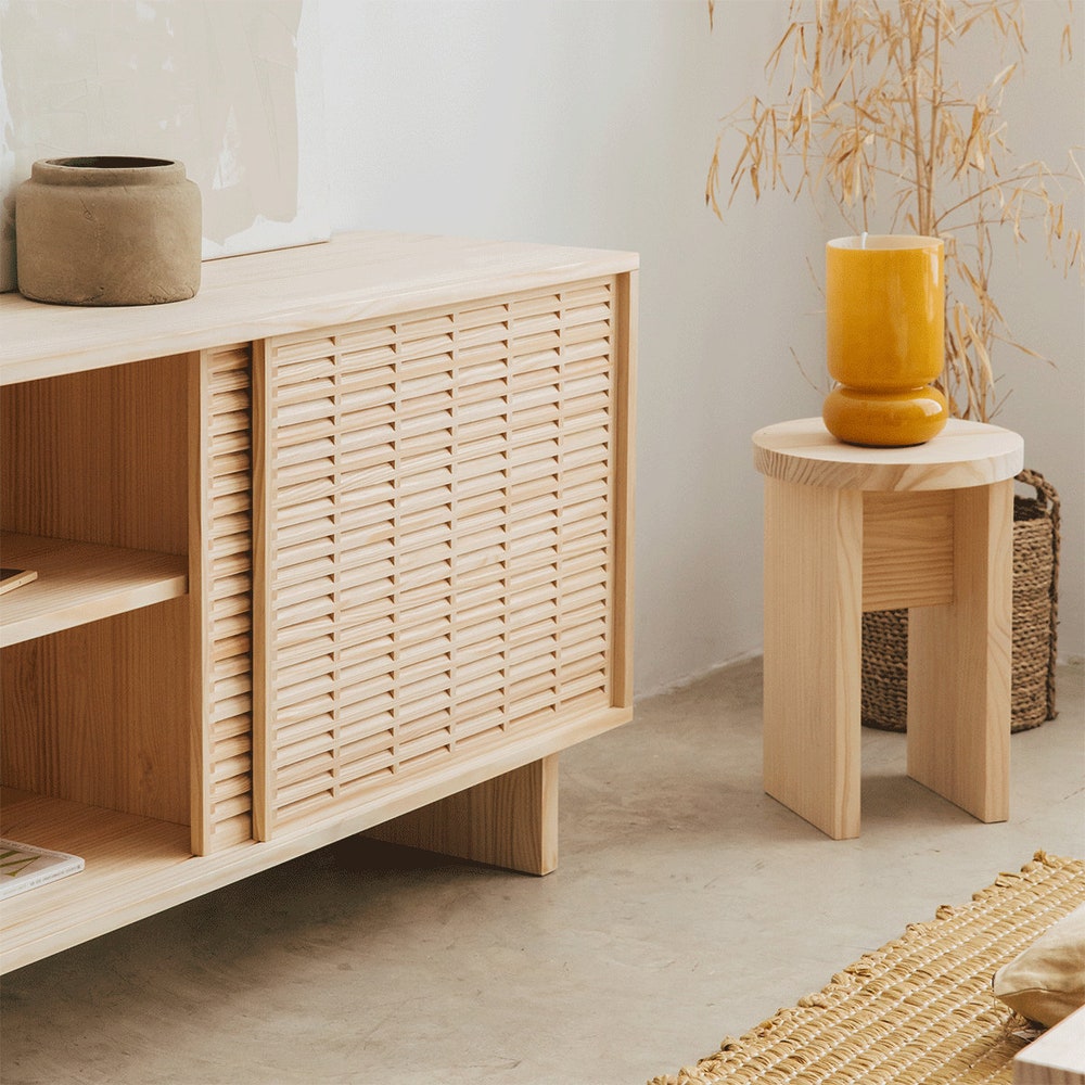 Introducing Cala, our low sideboard handcrafted from solid natural pine wood. This quality PEFC certified material is sustainable and durable, not only ensuring longevity, but also adding a natural, warm and welcoming look to your living room. This credenza features two sliding doors from our beautiful mallorquina and a design that combines timeless, Scandinavian style with a Mediterranean aesthetic.
