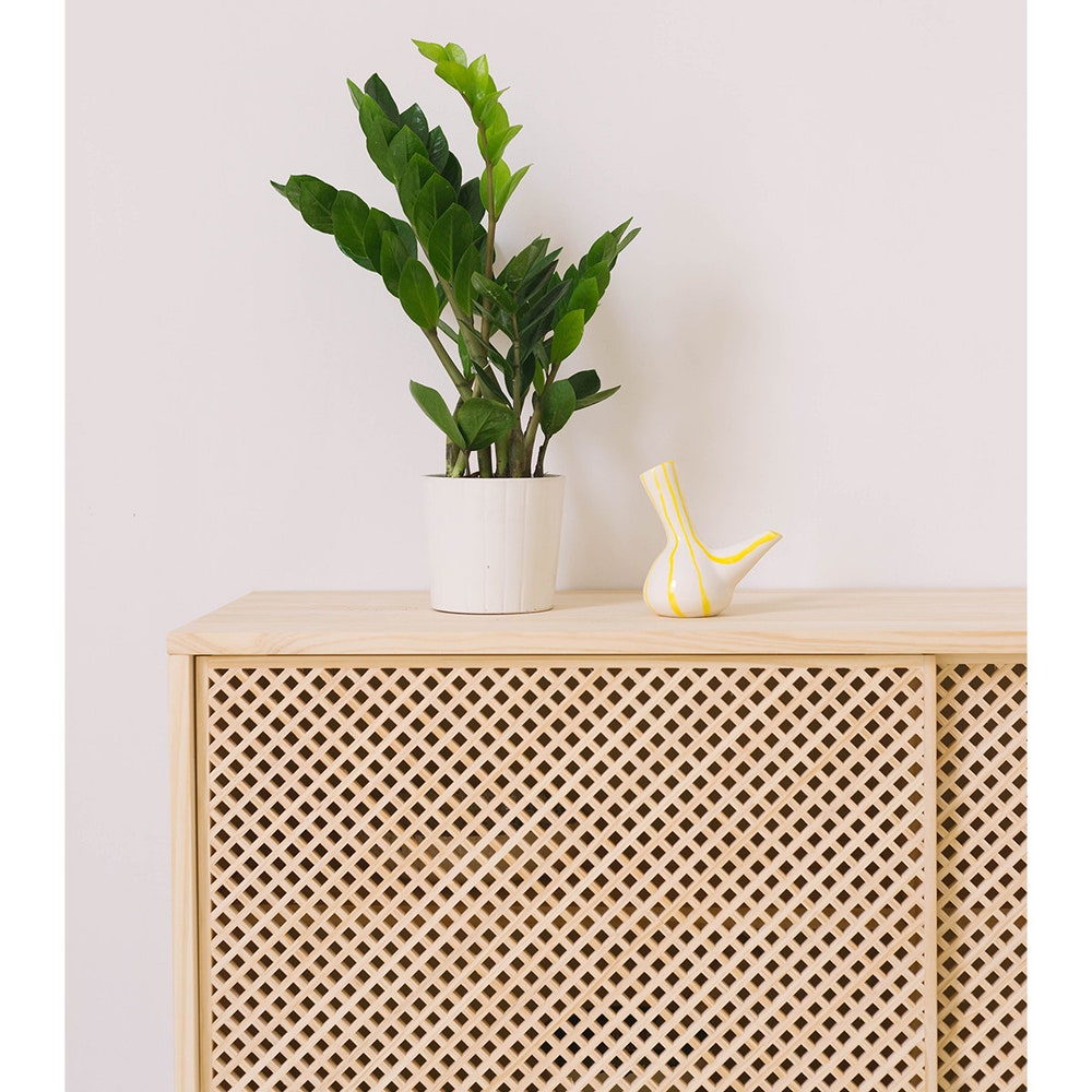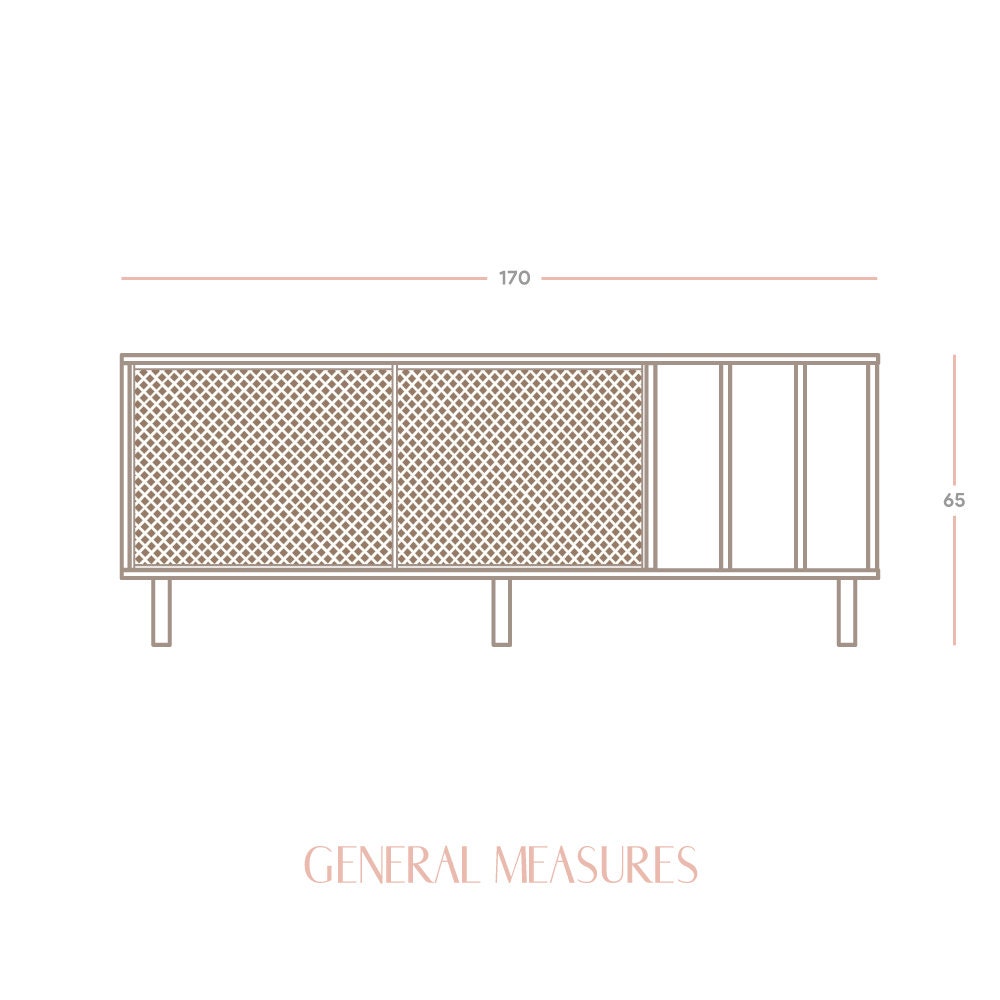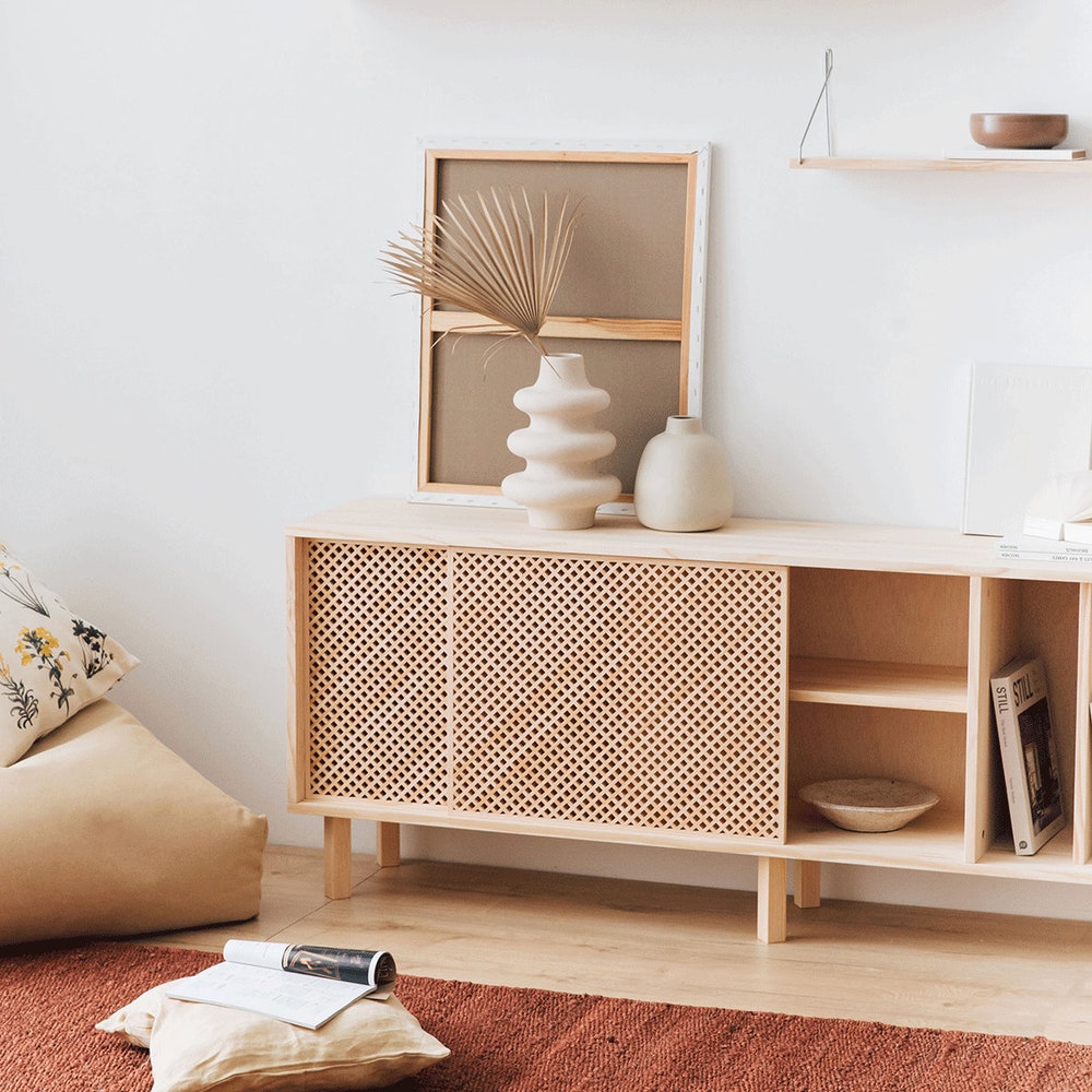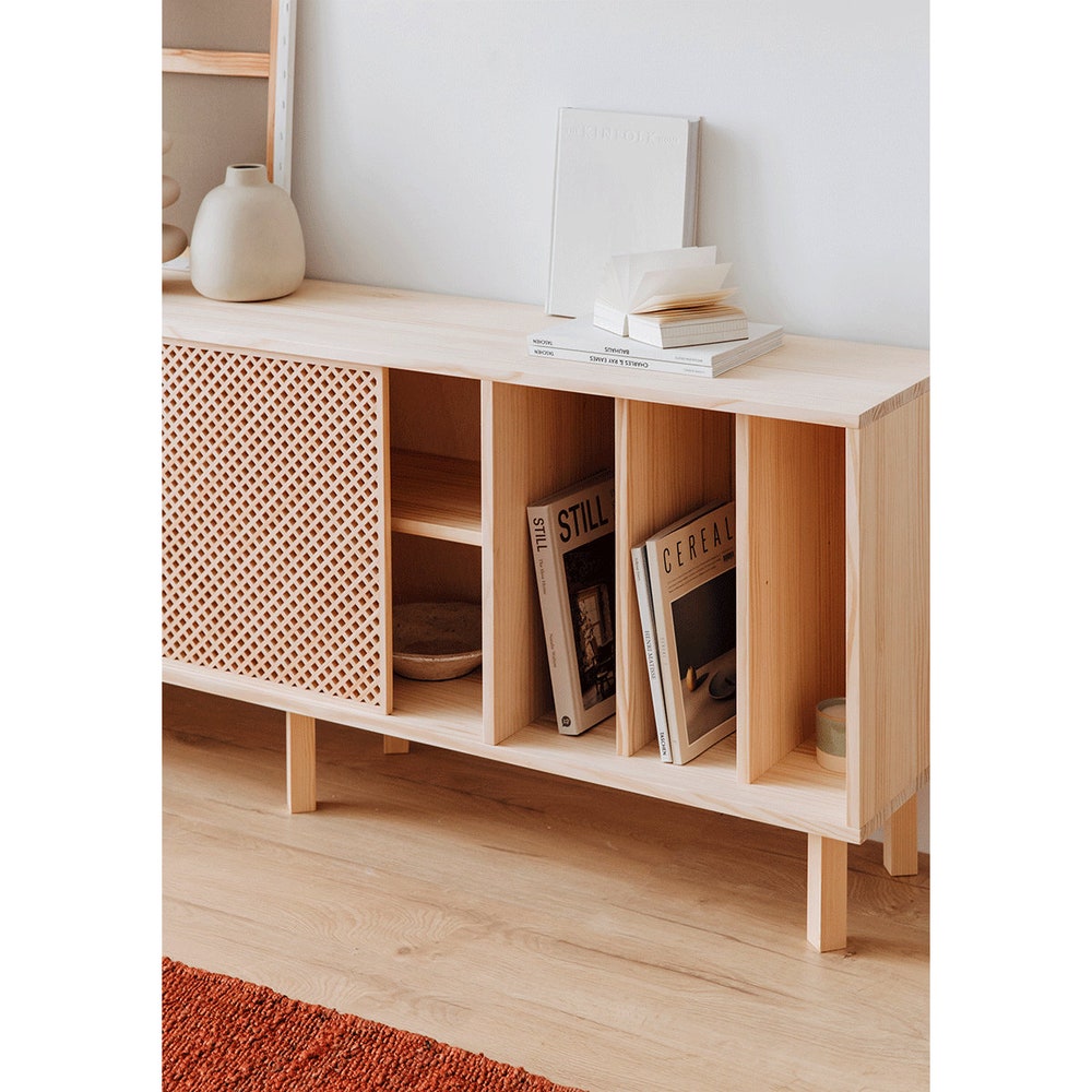 We present our low furniture, handcrafted with solid natural pine wood. Quality materials are PEFC certified to ensure sustainability and durability. This elegant credenza features two sliding doors of our beautiful lattice and design that effortlessly combines Scandinavian style with a timeless, Mediterranean aesthetic.