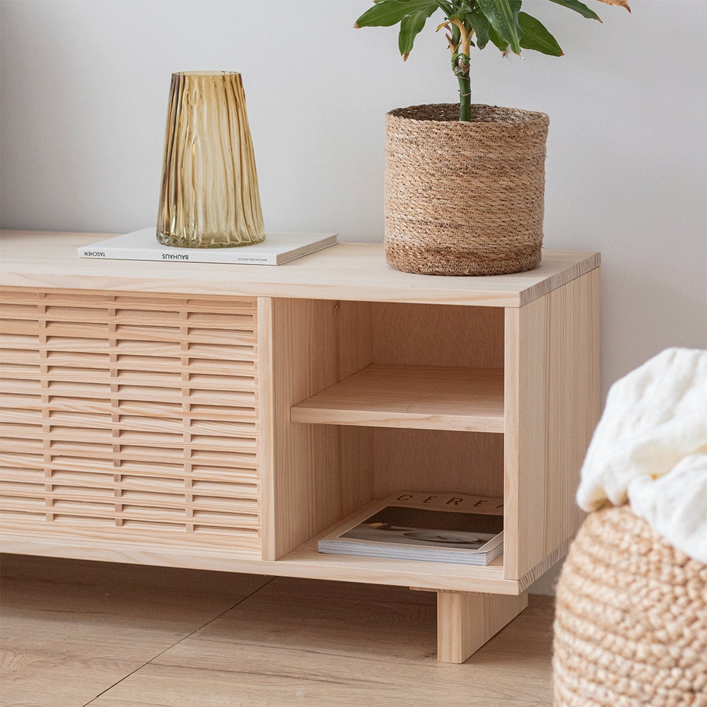 Introducing our Galera TV stand, handcrafted from solid natural pine wood. This quality PEFC-certified material is sustainable and durable, not only ensuring longevity but also adding a natural, warm, and inviting look to your living room. This media unit features two sliding doors made of our beautiful Mallorcan wood and two exterior shelves for displaying decorative items.