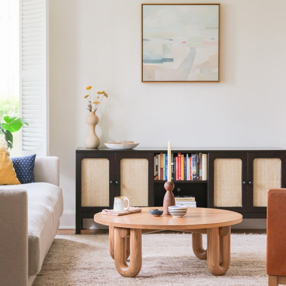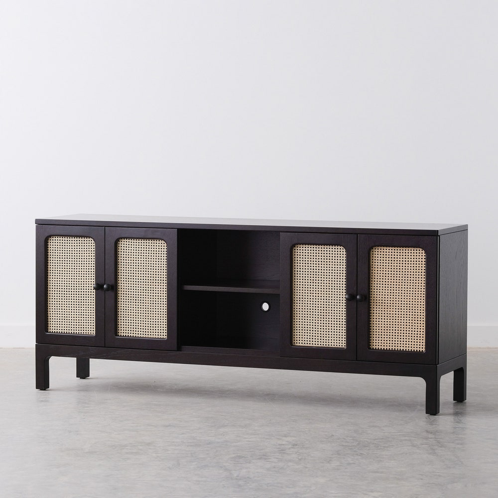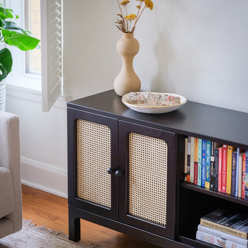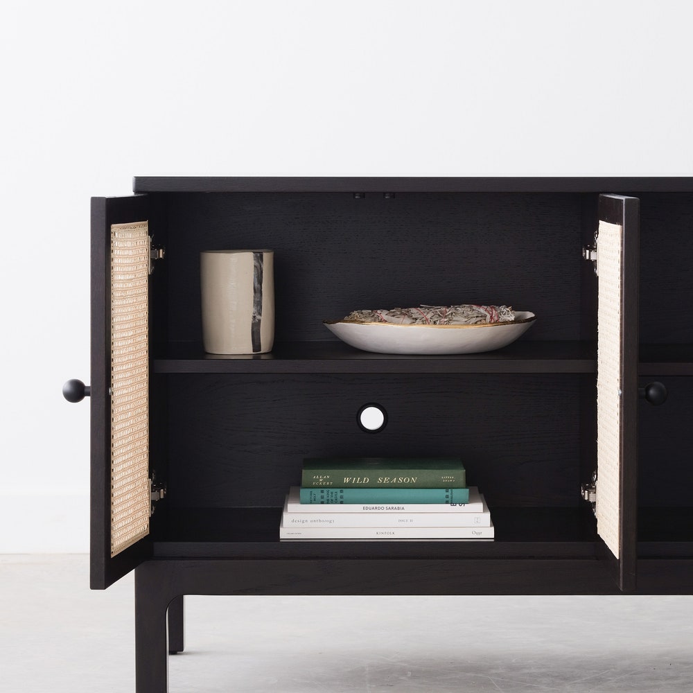Includes 3 adjustable shelves and 4 cane doors. Also includes 3 cord cutouts – 1 in each section, positioned low, centered. Pictured: Charcoal Dye on White oakHardware: flat black Ruth knobs Also available: White oak, Walnut, Cherry, MapleFinished with a clear, low sheen conversion varnish to provide durability and water resistance. DIMENSIONS64″ Wide x 15″ […]