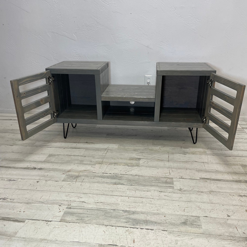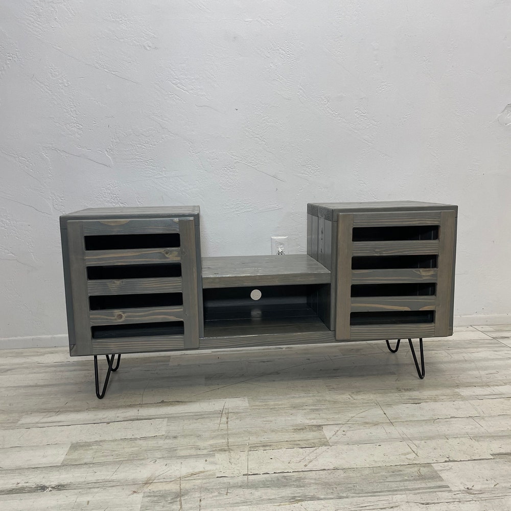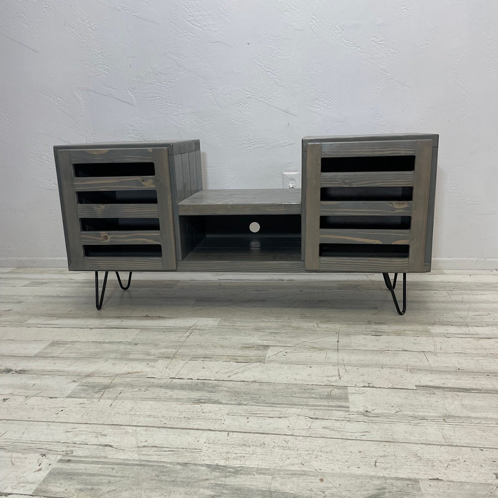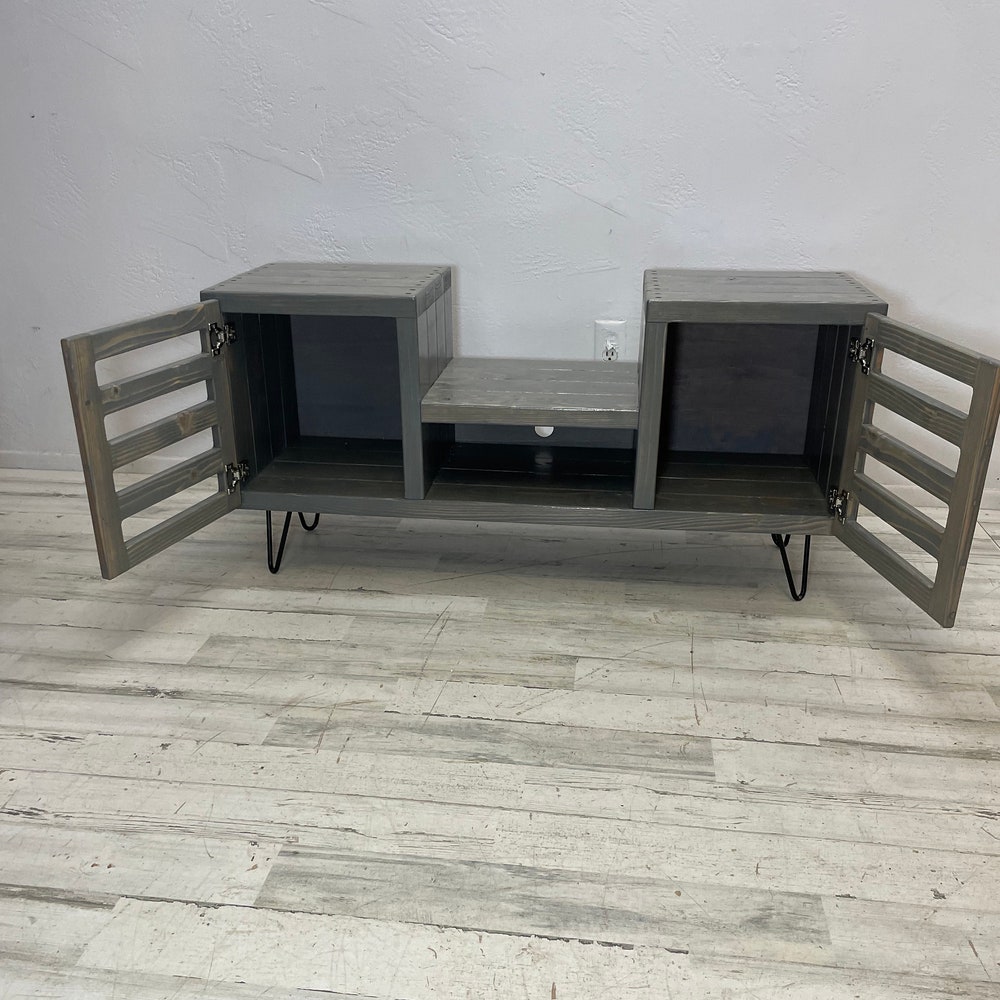 45 inch dropset with modern doors center section has an internal clearance of 15.25 inches classic gray stain-This item is perfect for a sonos speaker in the center -Hairpin legs can be upgraded to taller hairpin legs