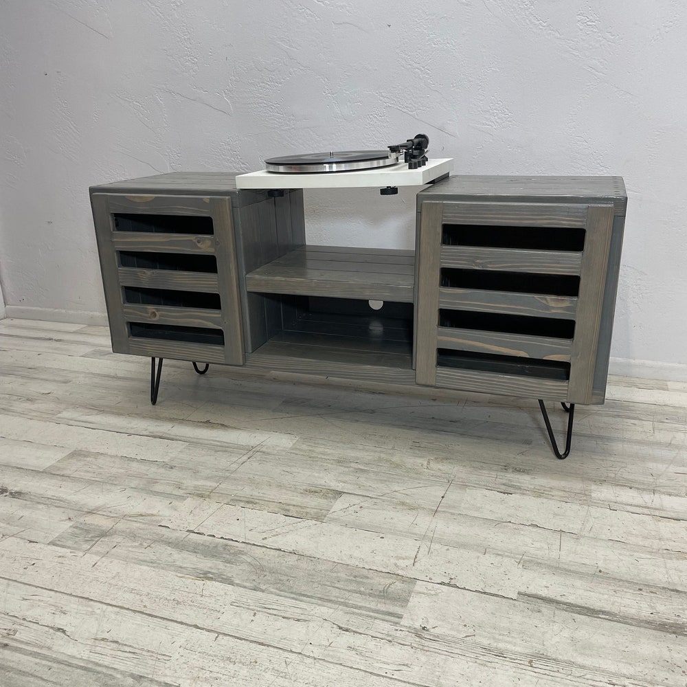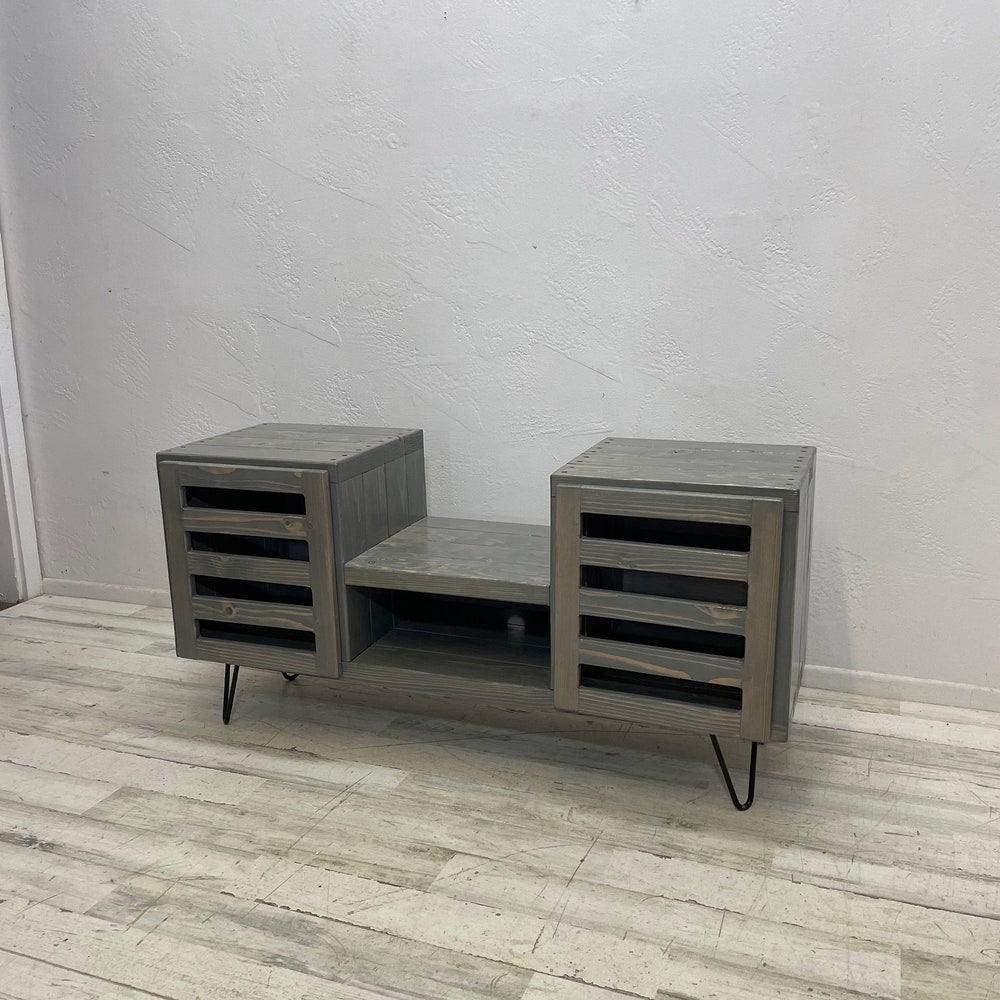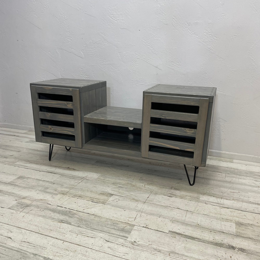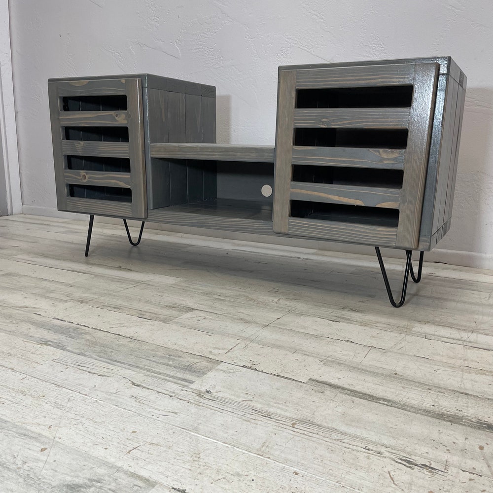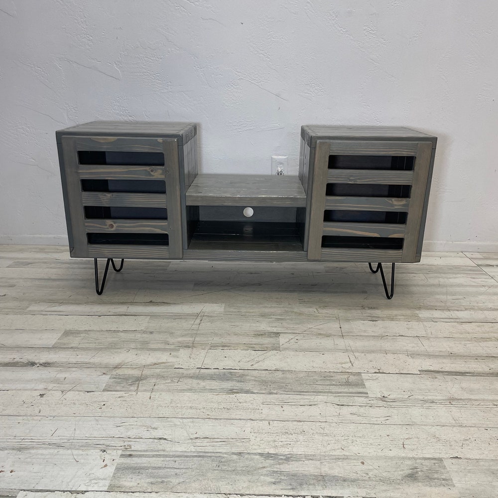 45 inch dropset with modern doors center section has an internal clearance of 15.25 inches classic gray stain-This item is perfect for a sonos speaker in the center -Hairpin legs can be upgraded to taller hairpin legs