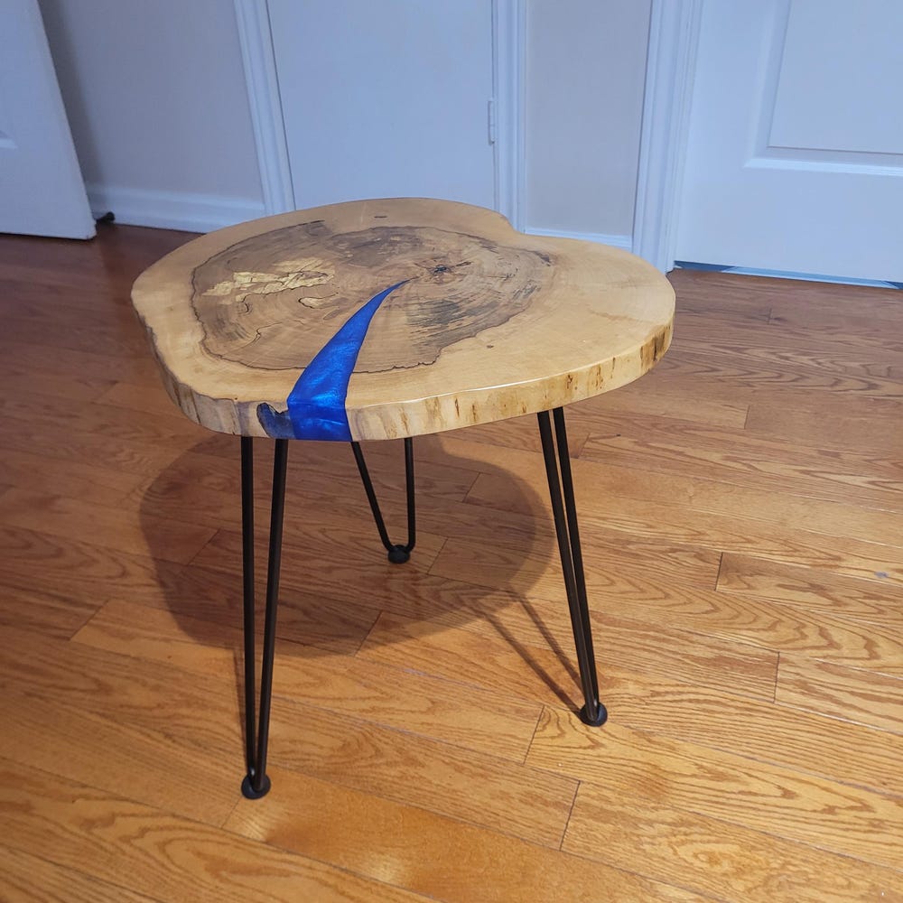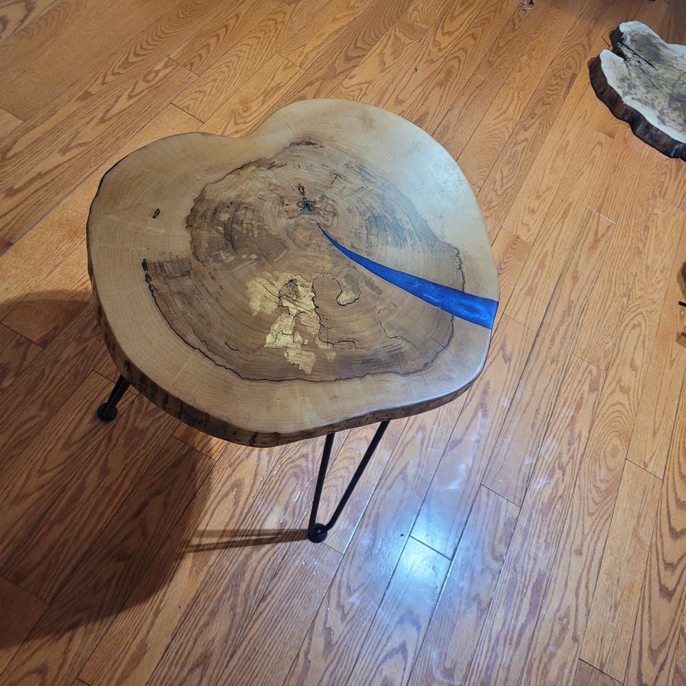 Spalted Maple Wood Cookie End Table with Blue Epoxy Resin