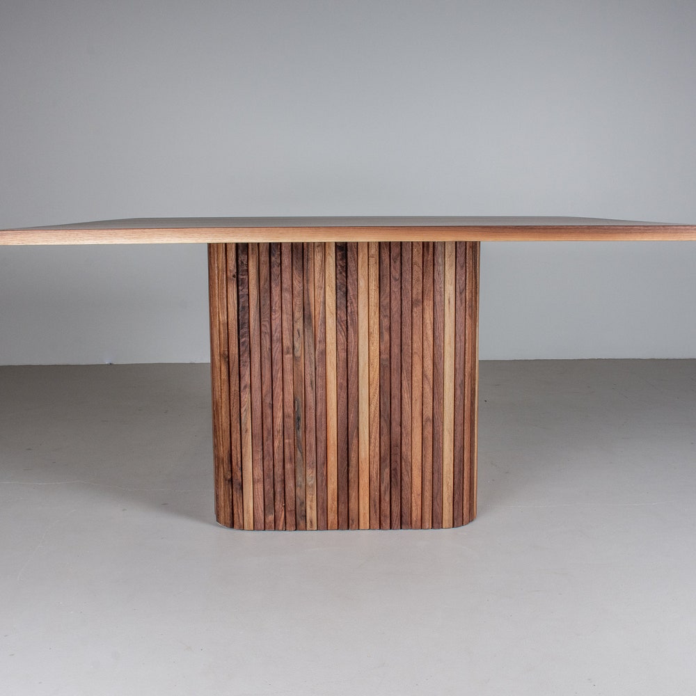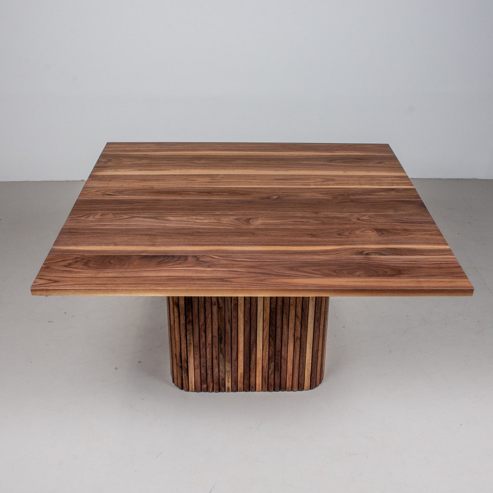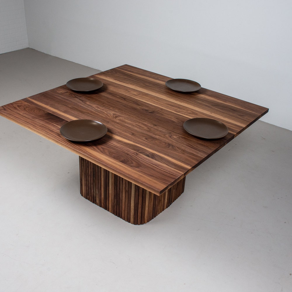 Celebrate a square dining room with a square pedestal dining table. This particular table is made of walnut and has a fluted base that adds an architectural element to the space. We build every table to order so there are many ways to make this table perfect for you.