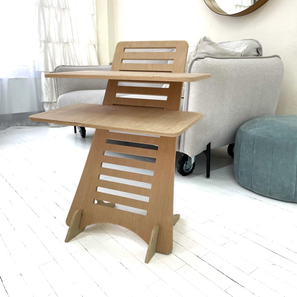 Upgrade your workspace with our adjustable plywood standing desk! Designed for comfort and productivity, this ergonomic dual-shelf stand is perfect for home offices, dorms, and creative setups.