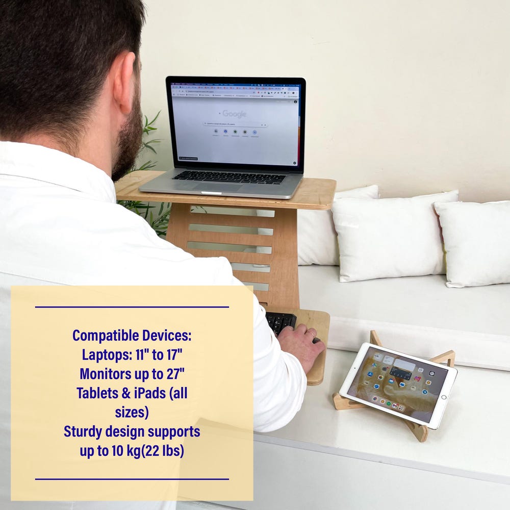 The StandEasy wooden laptop stand is designed to accommodate various device sizes: