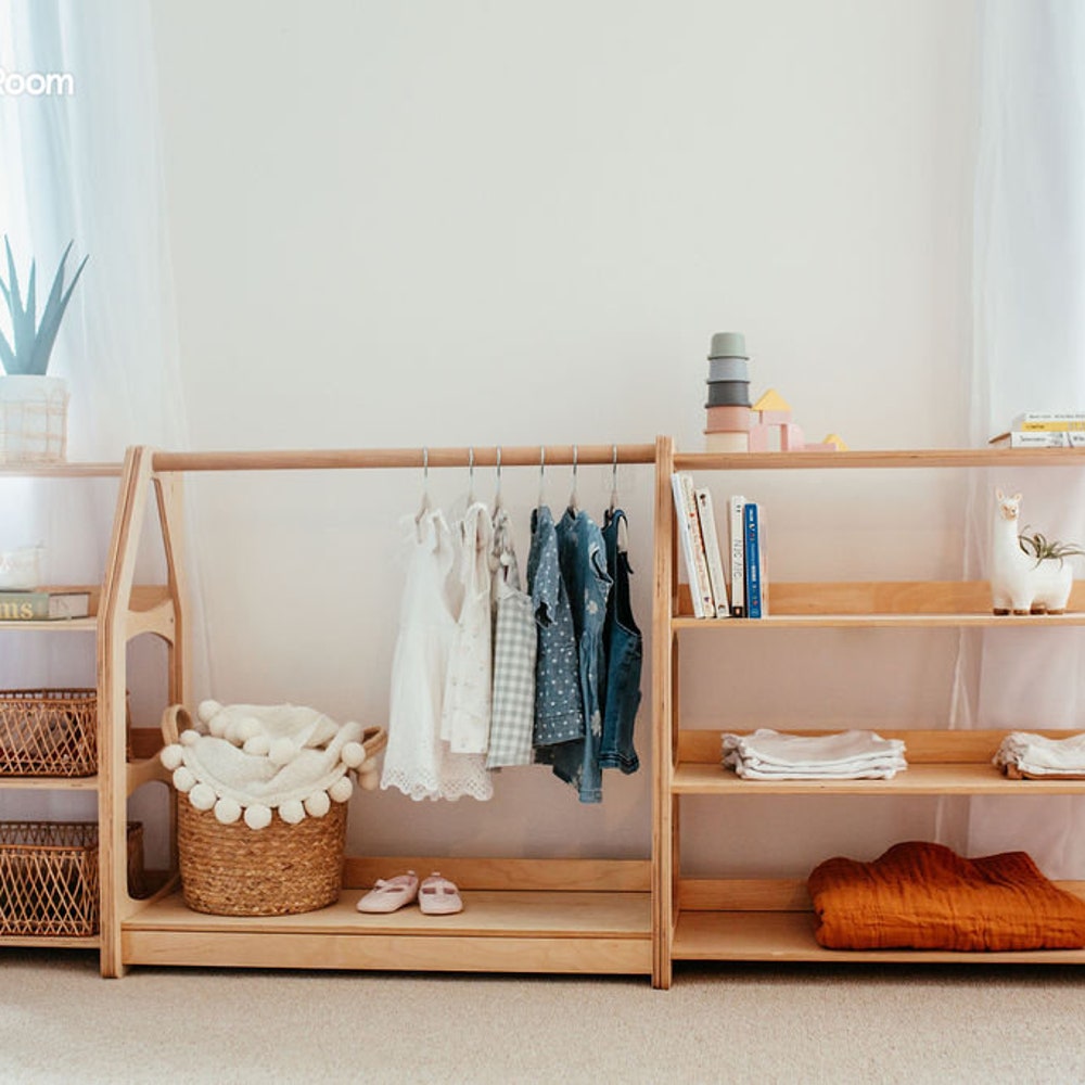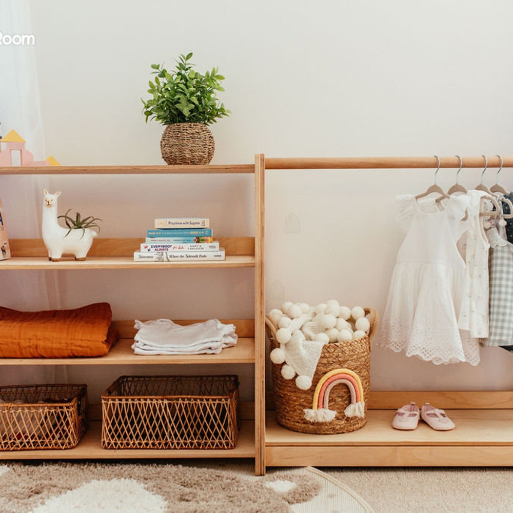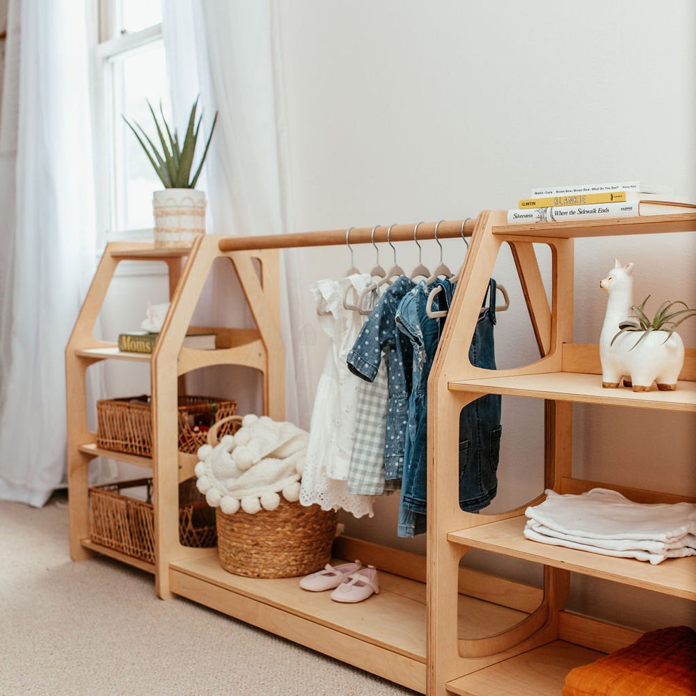 Storage Furniture for toddler playroom, Montessori cubby, Baby clothing rack, Wooden hanger, Girls dress up, Kid bookshelf, Toy Organizer