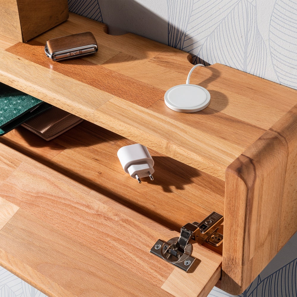 These Wooden Wall Shelves are designed for multi-purpose use and to be sit well with almost any decoration style. You can use it as a floating shelf to keep your stuffs tidy and also as a power station which allows you to keep your electronics and cables organized.