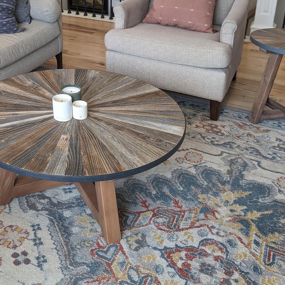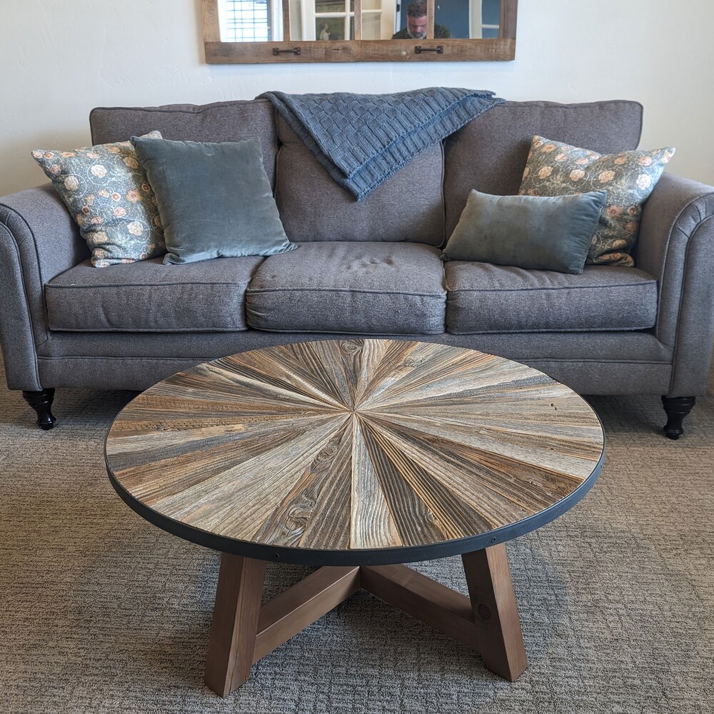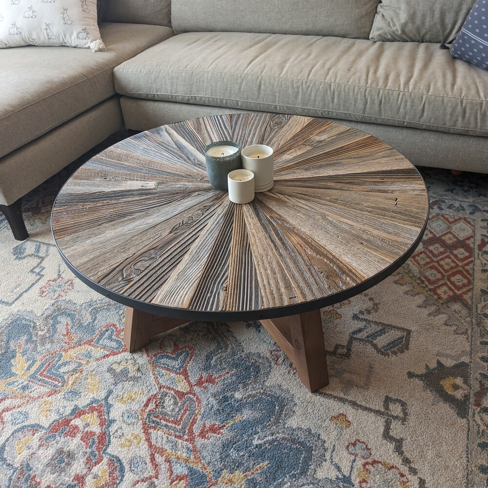 Sunburst Pattern Reclaimed Barn Wood Coffee Table | Unique Round Rustic Coastal Farmhouse Living Room Furniture w/Distressed Accent Colors