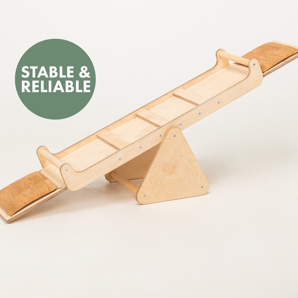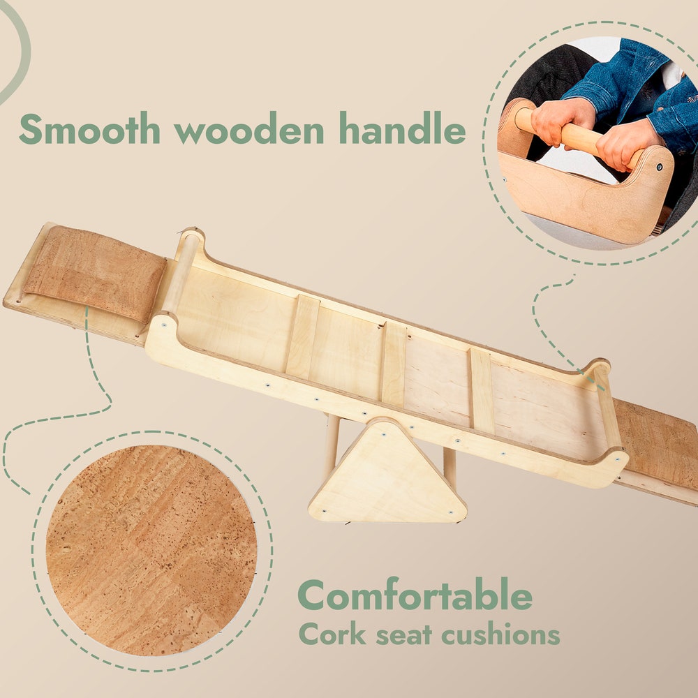 ⭐The swing is made of high quality-wood and equipped with two cork cushions for the babies’ comfort. Our seesaw also has comfortable handles on both sides, so the toddlers can hold them while playing, thus the adults are more relaxed.