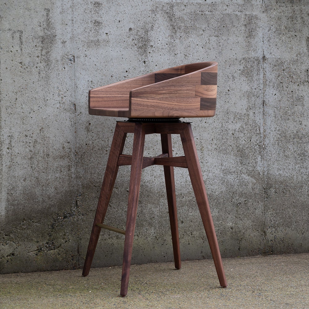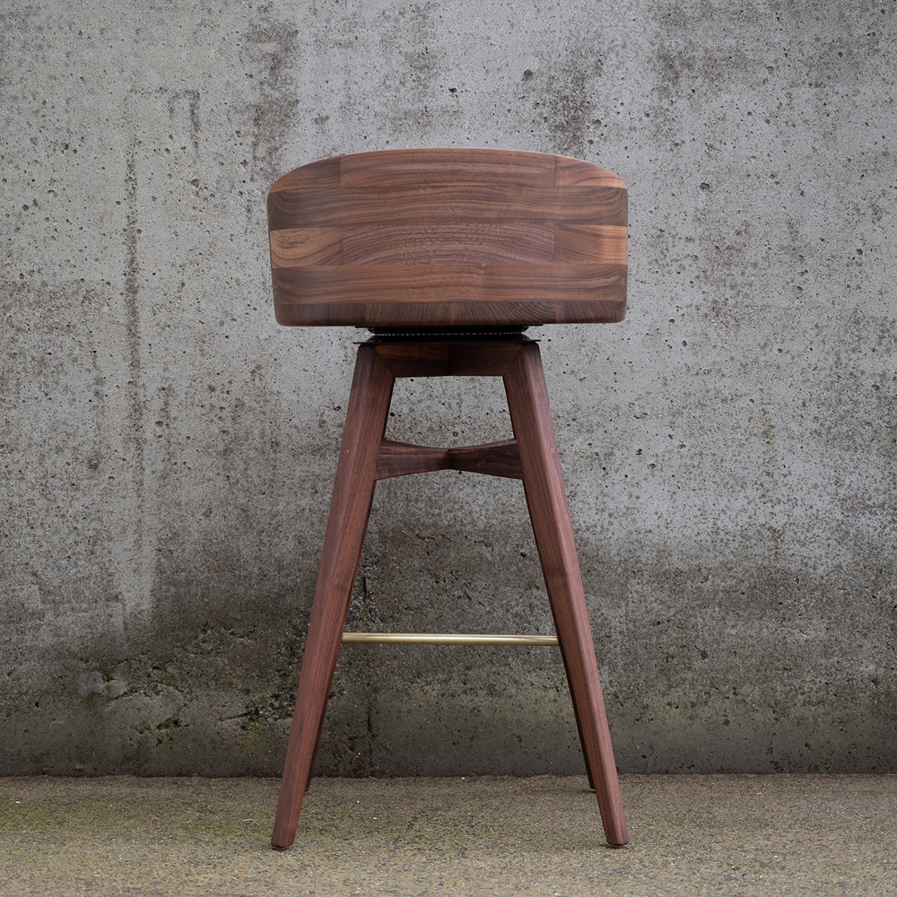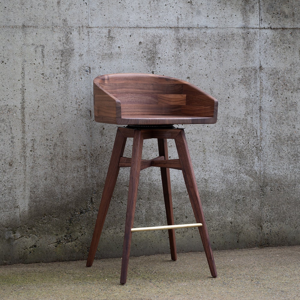 This is a full size, modern, hand-sculpted bucket seat stool mounted on a black powder-coated swivel plate. Built using mortise and tenon joinery throughout the frame, and footrest options include brushed brass, stainless steel, or solid wood.