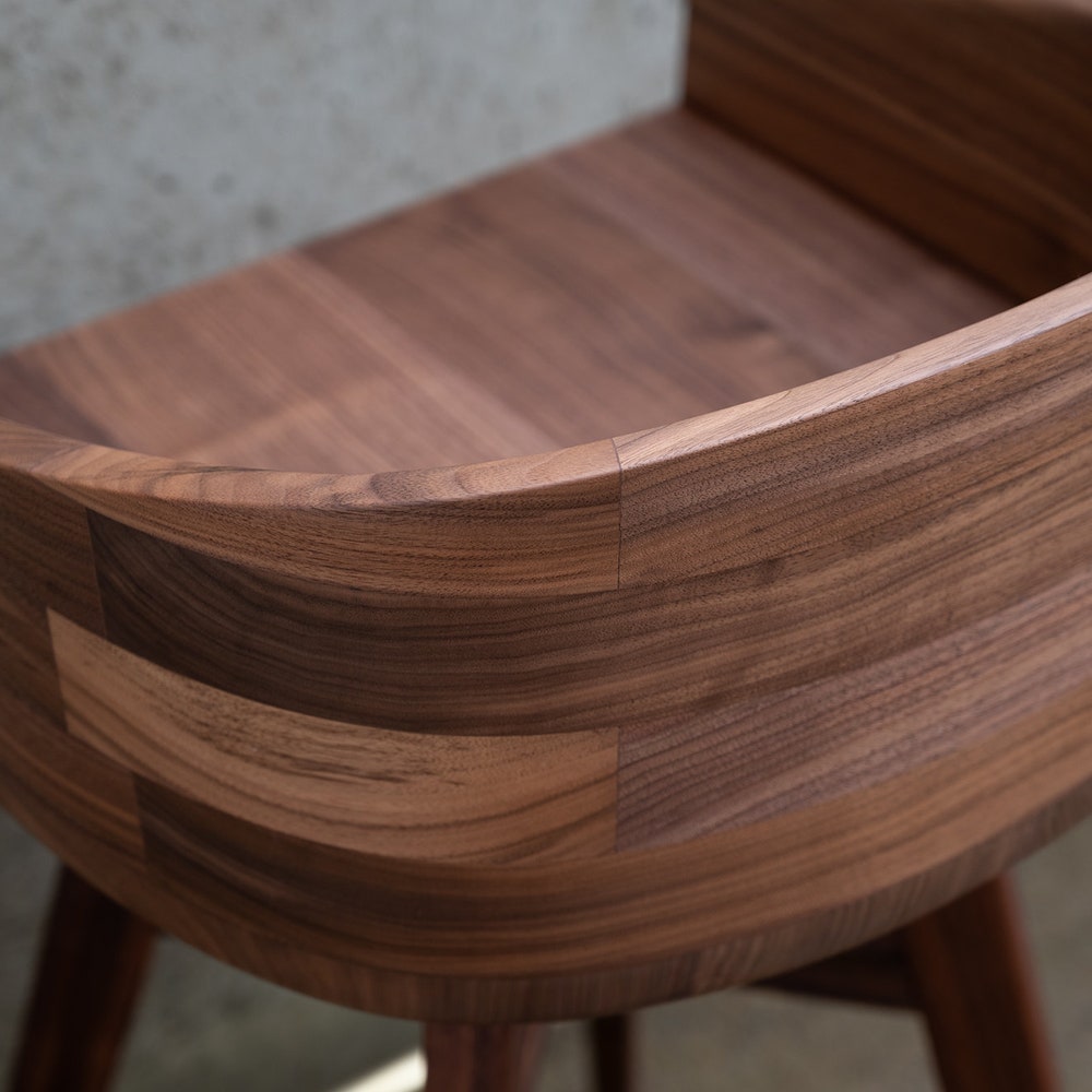 We only use 100% solid wood, the bucket is stack-laminated to create a form that hugs the user and also provides a minimalist low armrest.