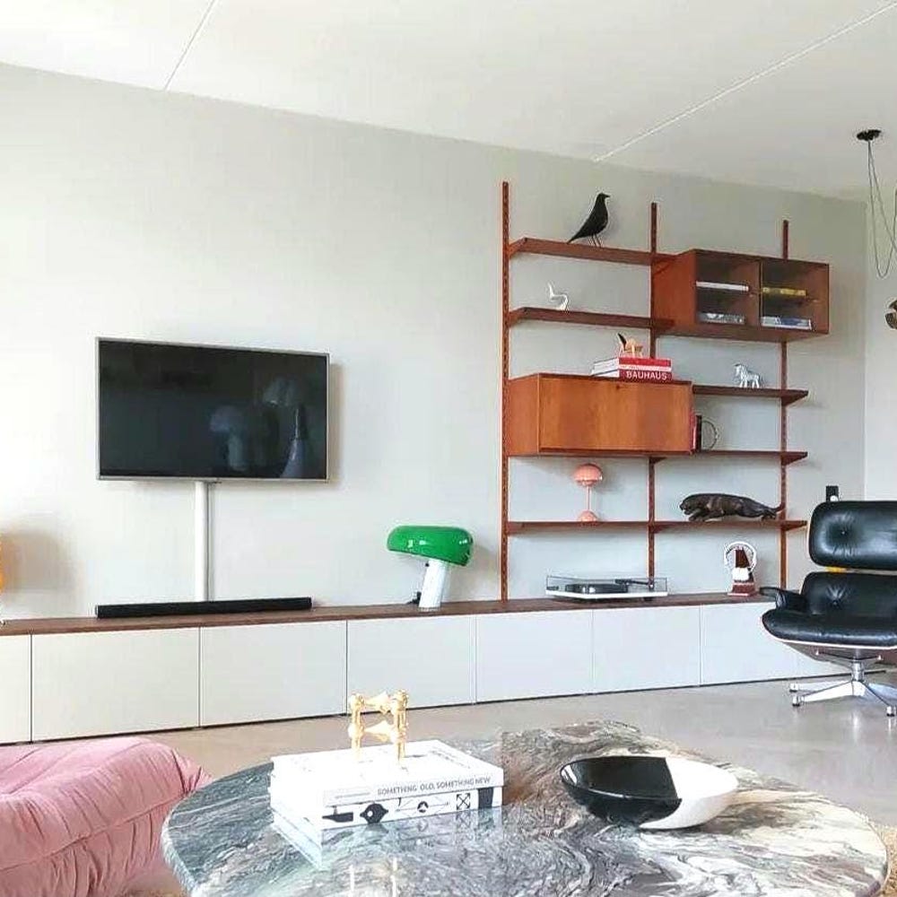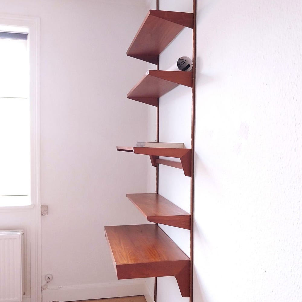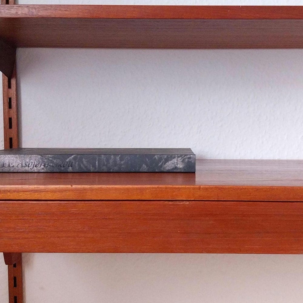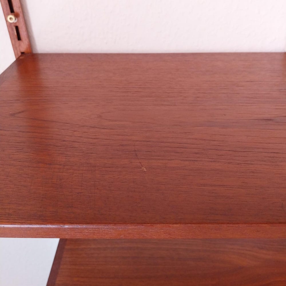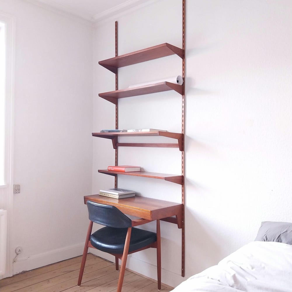 Wall mounted rails (teak with metal on the back) fitted with 4 solid teak wood shelves and a beautiful, minimalistic teak desk with a practical drawer (Rails can be shortened before dispatch, free of charge.)
