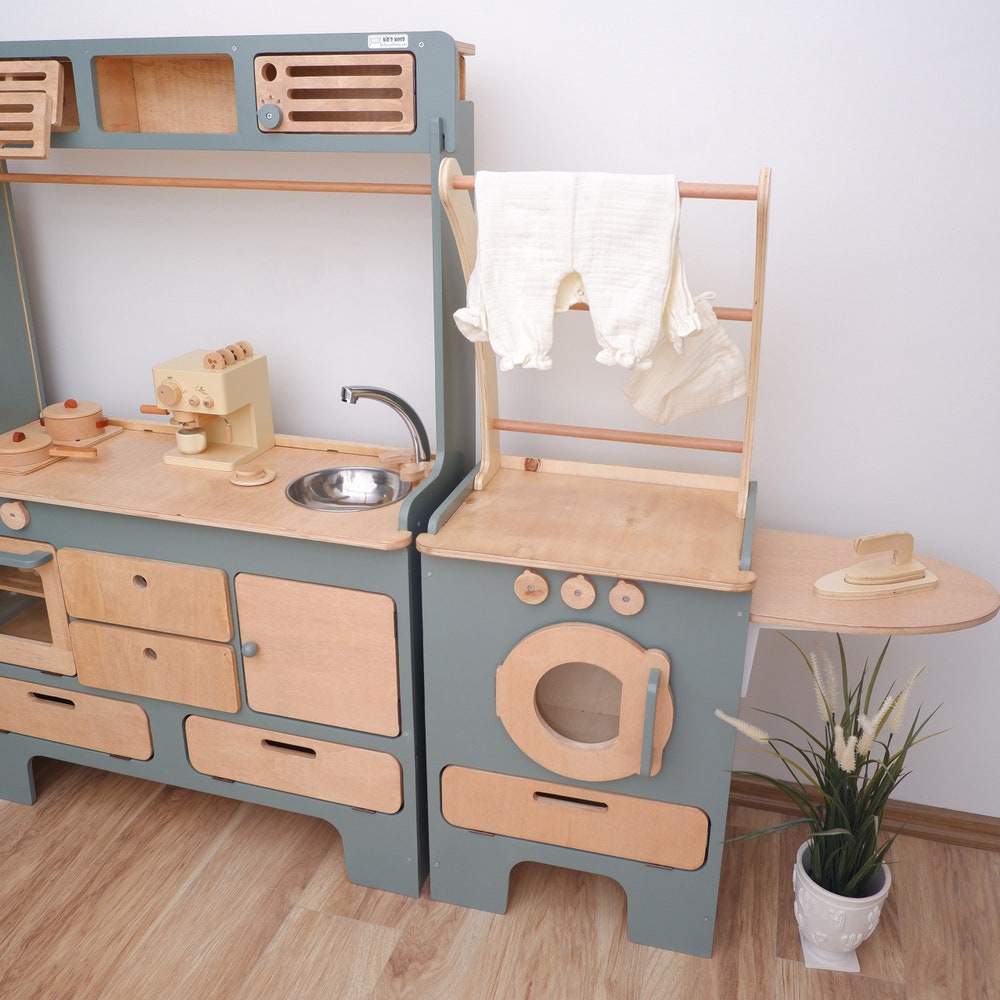 Our Wooden Play Kitchen is a perfect addition to any child’s playroom or nursery. This handmade play kitchen set, crafted with care and attention to detail, offers a delightful space for kids to engage in pretend play, enhancing their creativity and imagination. Designed in a Montessori style, this eco-friendly toy kitchen provides a safe and natural play environment for both boys and girls, making it an ideal choice for any home or learning space.