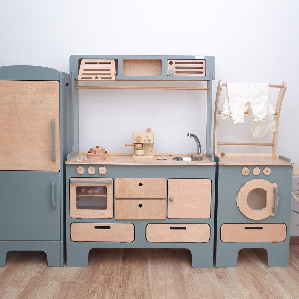 Encourage your child’s love for role-playing with this beautifully crafted kids play kitchen. Whether you are looking for a custom play kitchen to match your decor or a sturdy wooden kitchen set that will last for years, this set has it all. Perfect for toddlers and children, this pretend play kitchen is not only a wonderful wooden playset for kids but also a stylish piece of nursery furniture that fits seamlessly into any room.