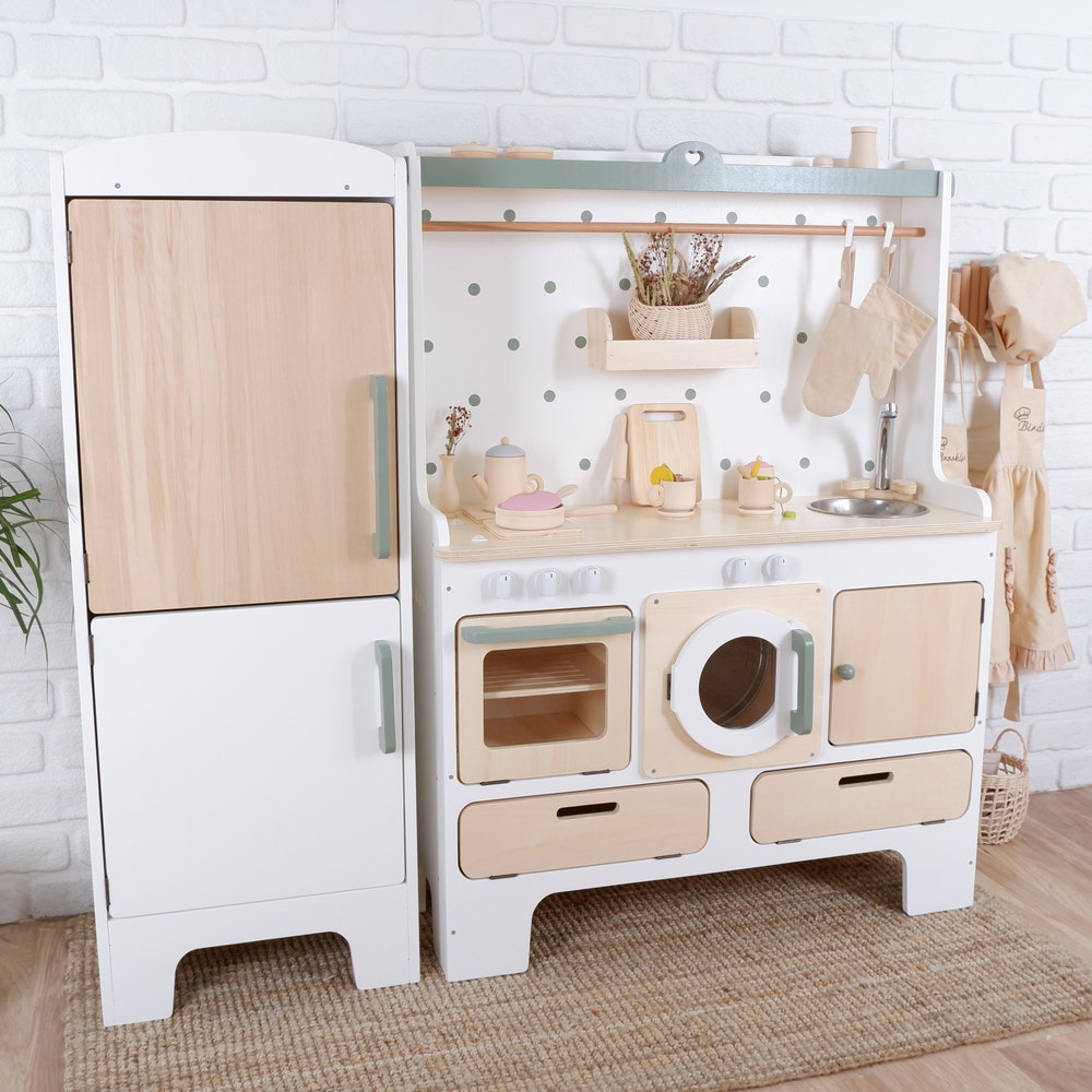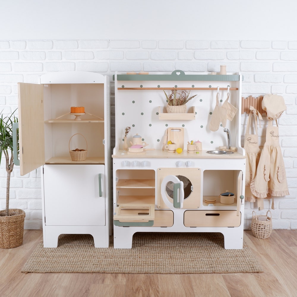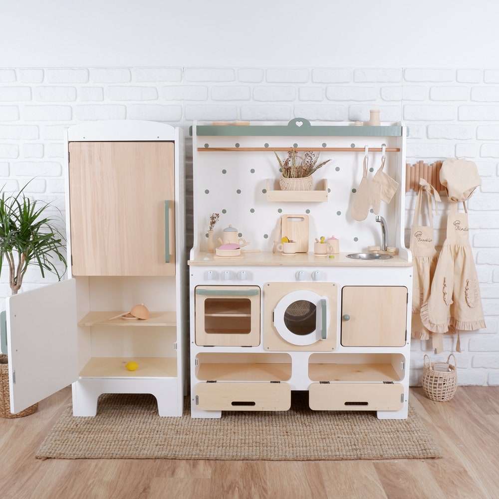 Encourage your child’s love for role-playing with this beautifully crafted kids play kitchen. Whether you are looking for a custom play kitchen to match your decor or a sturdy wooden kitchen set that will last for years, this set has it all. Perfect for toddlers and children, this pretend play kitchen is not only a wonderful wooden playset for kids but also a stylish piece of nursery furniture that fits seamlessly into any room.
