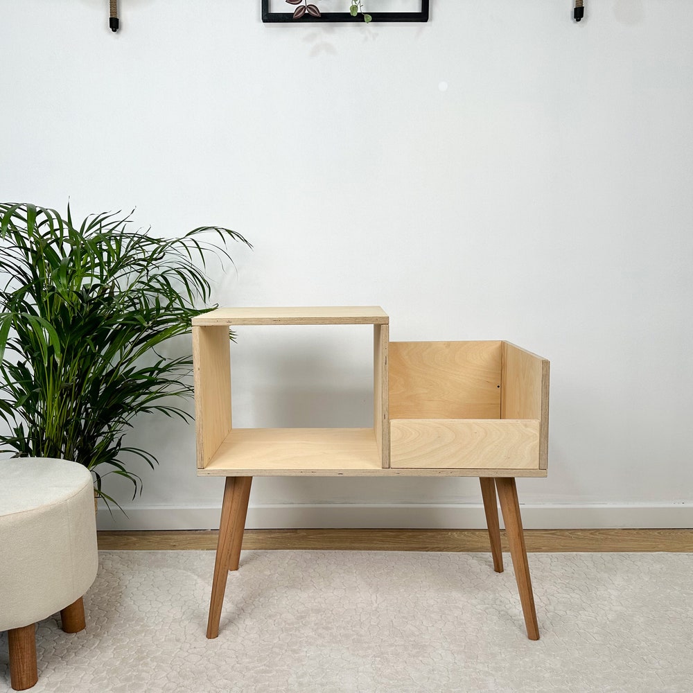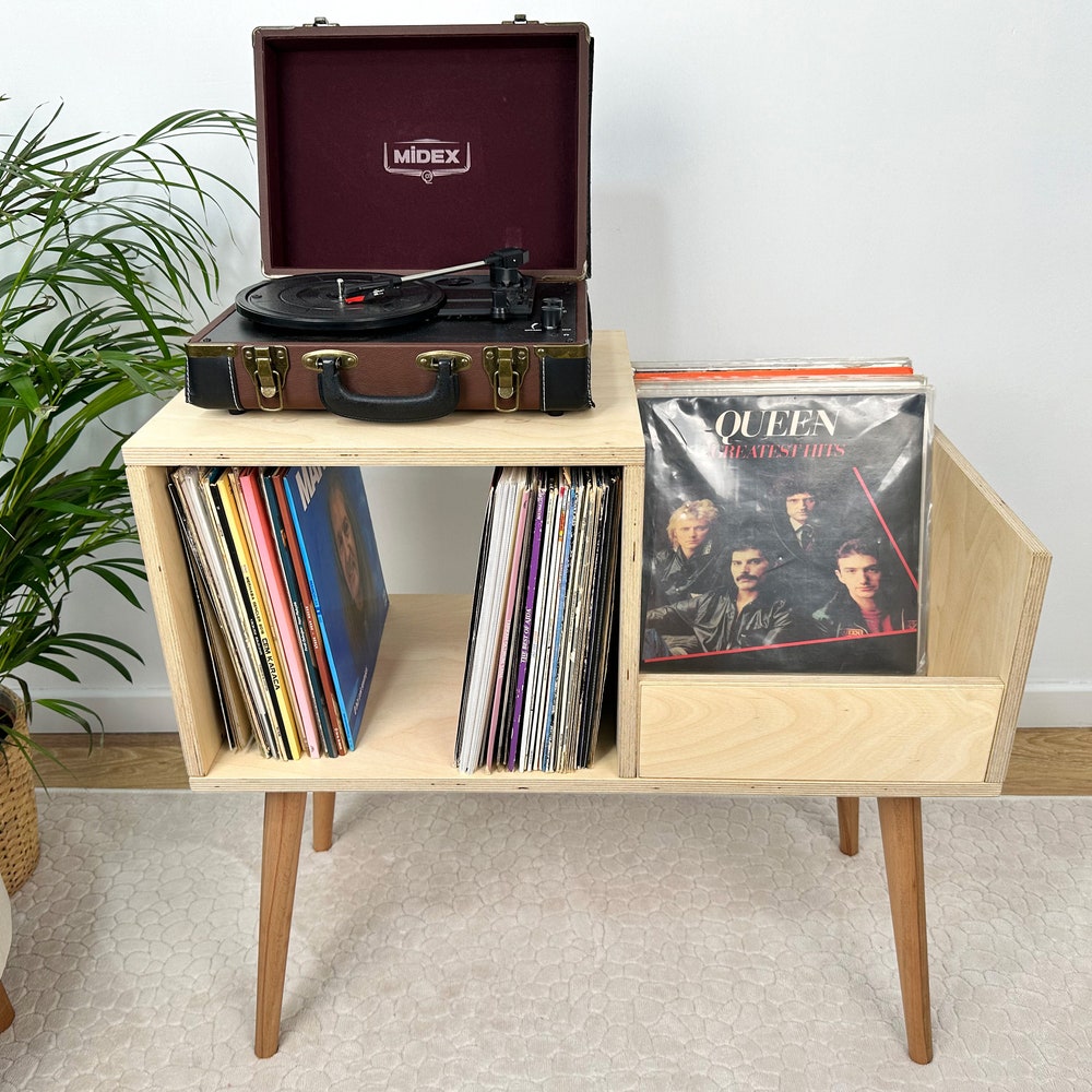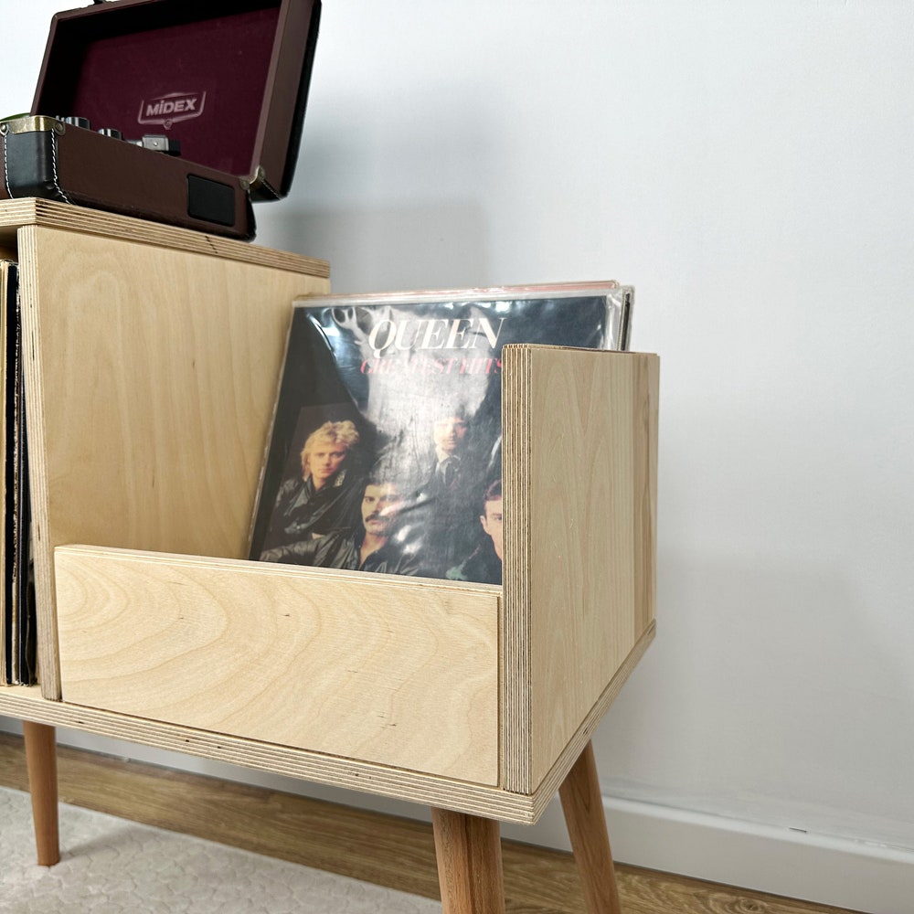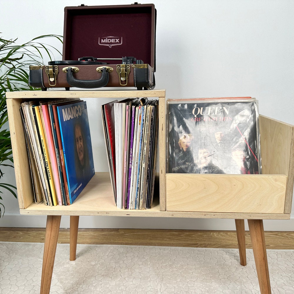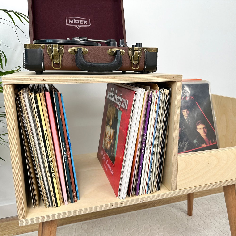 This turntable stand is meticulously crafted from 100% birch plywood, showcasing our dedication to craftsmanship. We offer four wood options: pine, oak, walnut, and birch plywood. You can see the wood options and color choices in the photos. We aim to bring quality and elegance to your home by translating our impeccable craftsmanship into furniture.