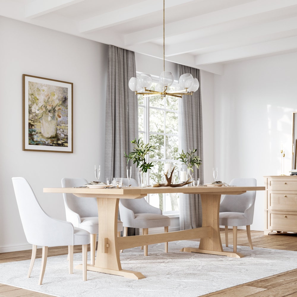 Our solid maple trestle dining table is the perfect kitchen table for your home! From modern to contemporary to rustic, our rectangular maple dining table is the perfect way to seat your whole family for a holiday meal. We start with beautiful maple lumber milled in Pennsylvania, and hand sand and finish it with a commercial grade conversion varnish.. You’ll love seeing the beautiful grain permeate through the wood, showcasing the work mother nature slowly did over time.