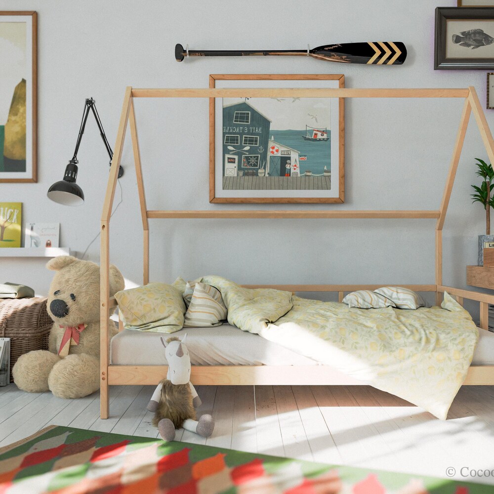 Toddle Beige Canopy Bed, House Bed Frame for Kids, Floor Toddler Bed with Rails, Solid Wood Bed, Nursery Furniture, Twin bed ,Full bed