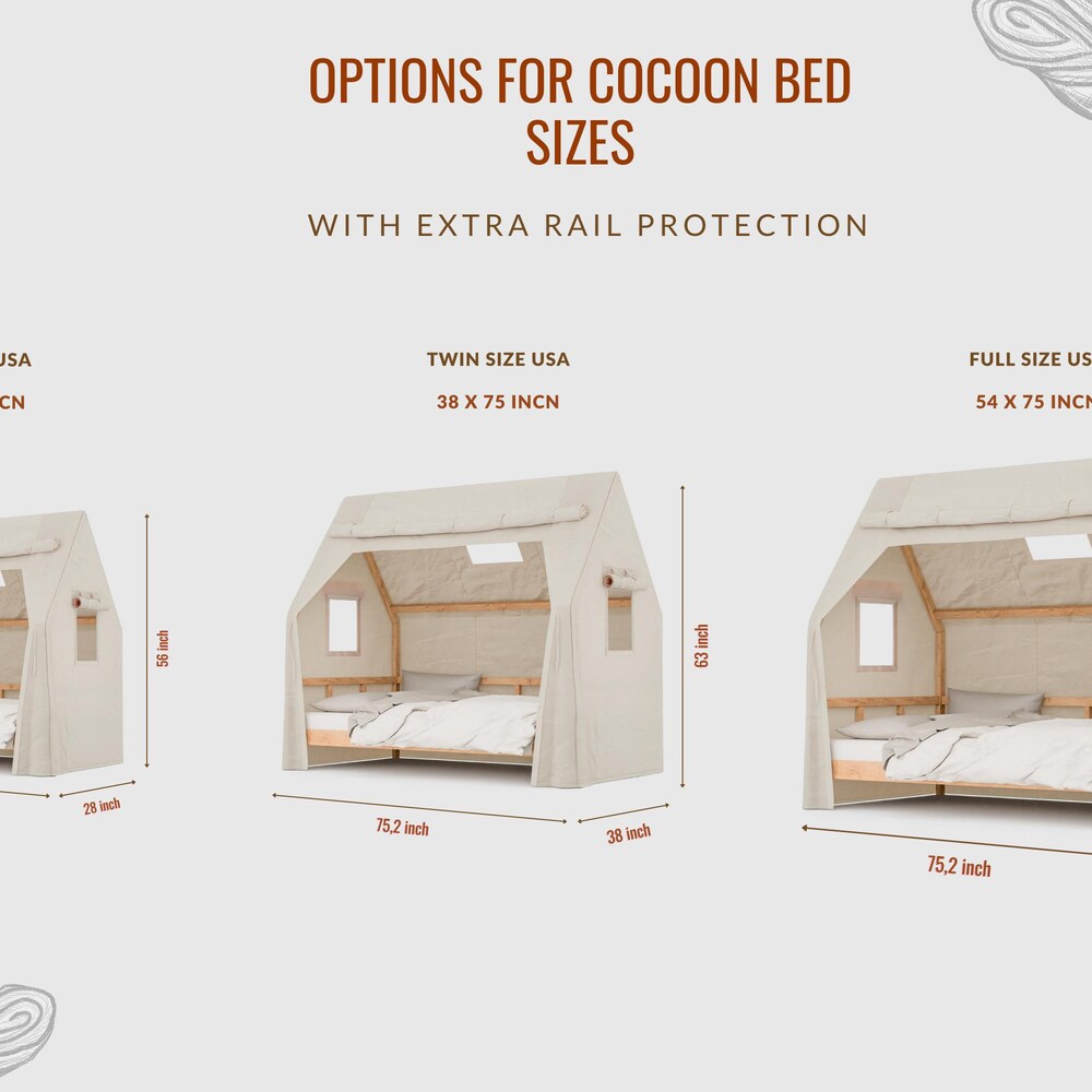 Bed Canopy made from 100% natural, dense cotton fabric, with two side windows and one roof window, all with curtains, and an adjustable front door curtain with three positions.
