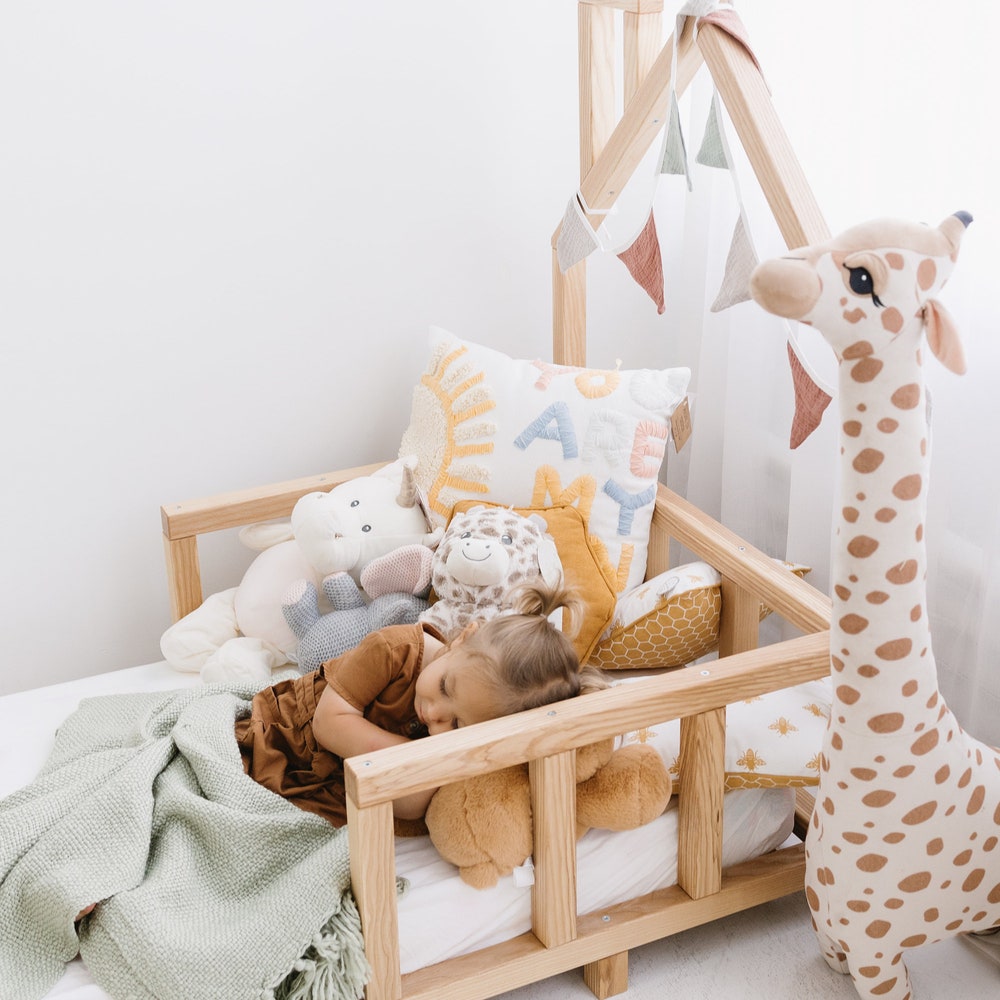 This Montessori wooden floor toddler bed embodies the principles of the Montessori educational approach by offering a safe, accessible, and aesthetically pleasing sleep environment that empowers your child to take charge of their sleep routine and engage with their surroundings independently.