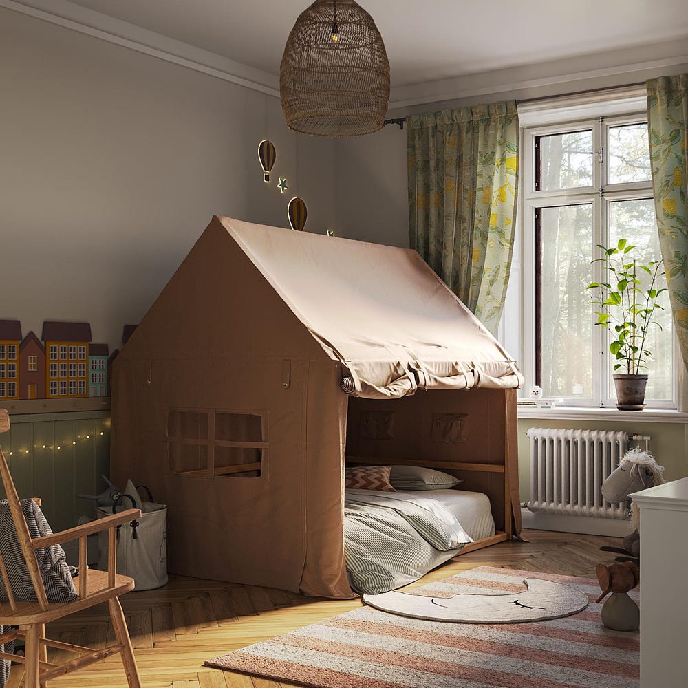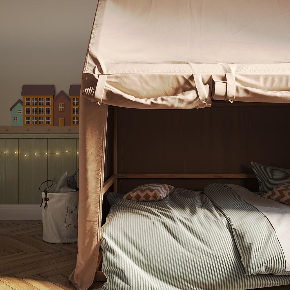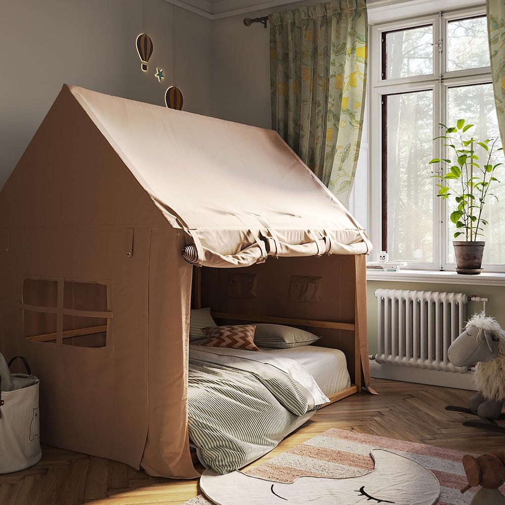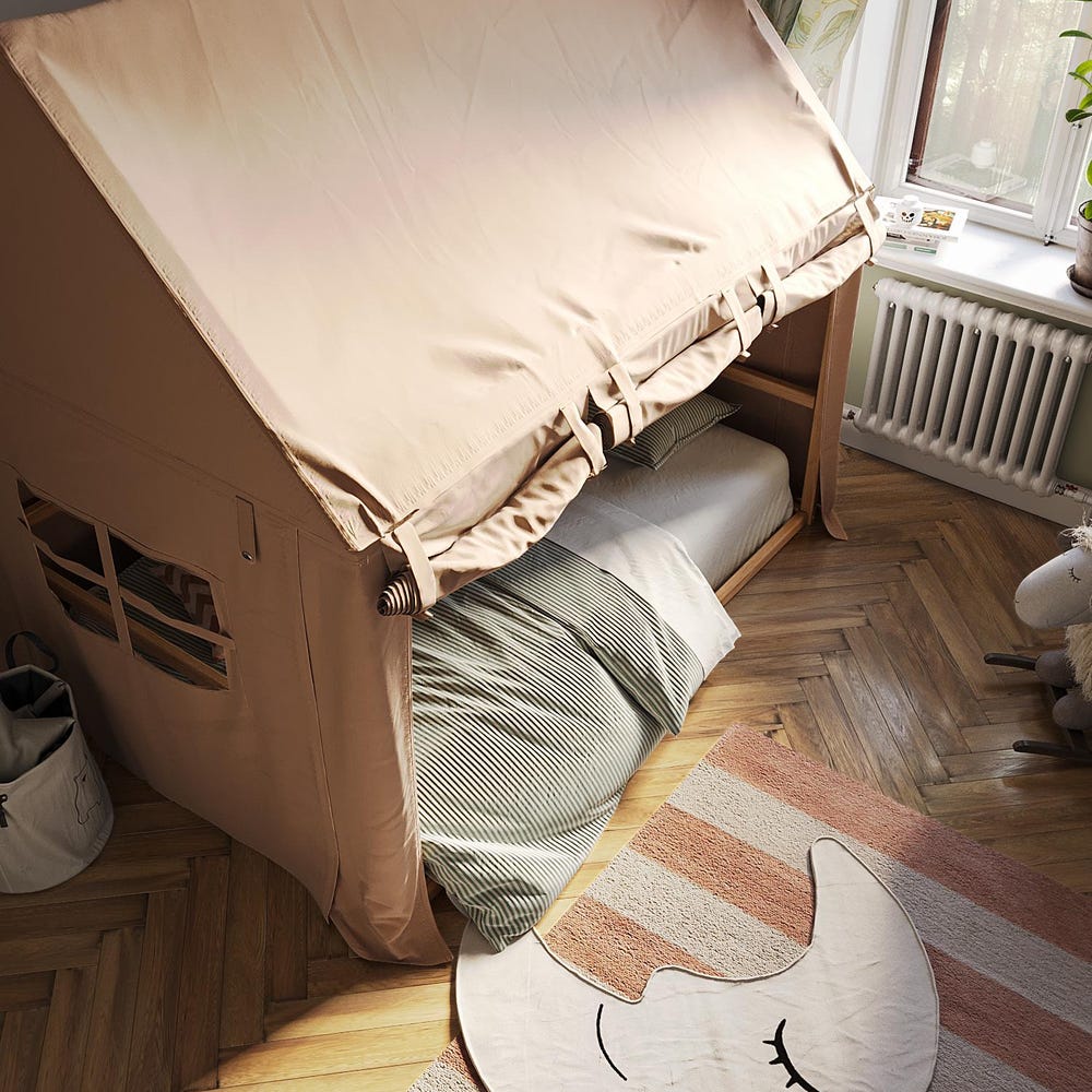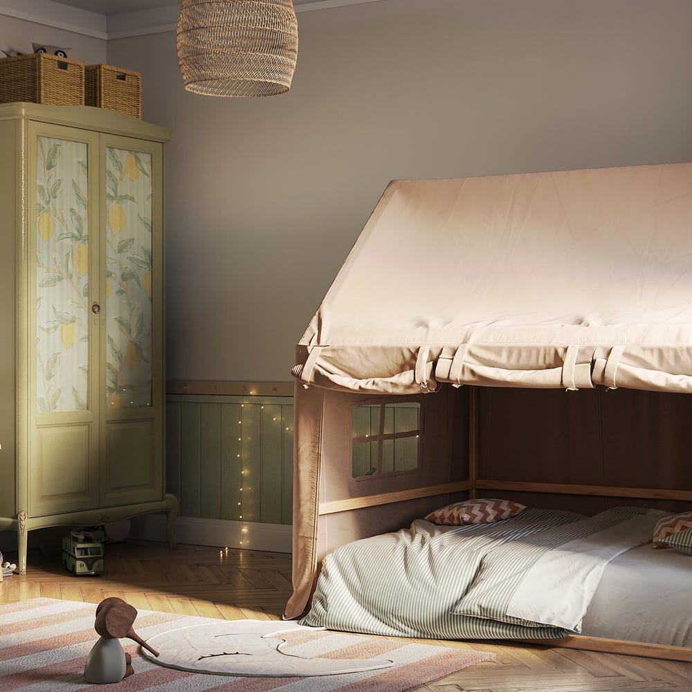 Additionally, the bed comes with a textile canopy that transforms it into a cozy playhouse, making it not just a place for rest but also a space for imagination and play.