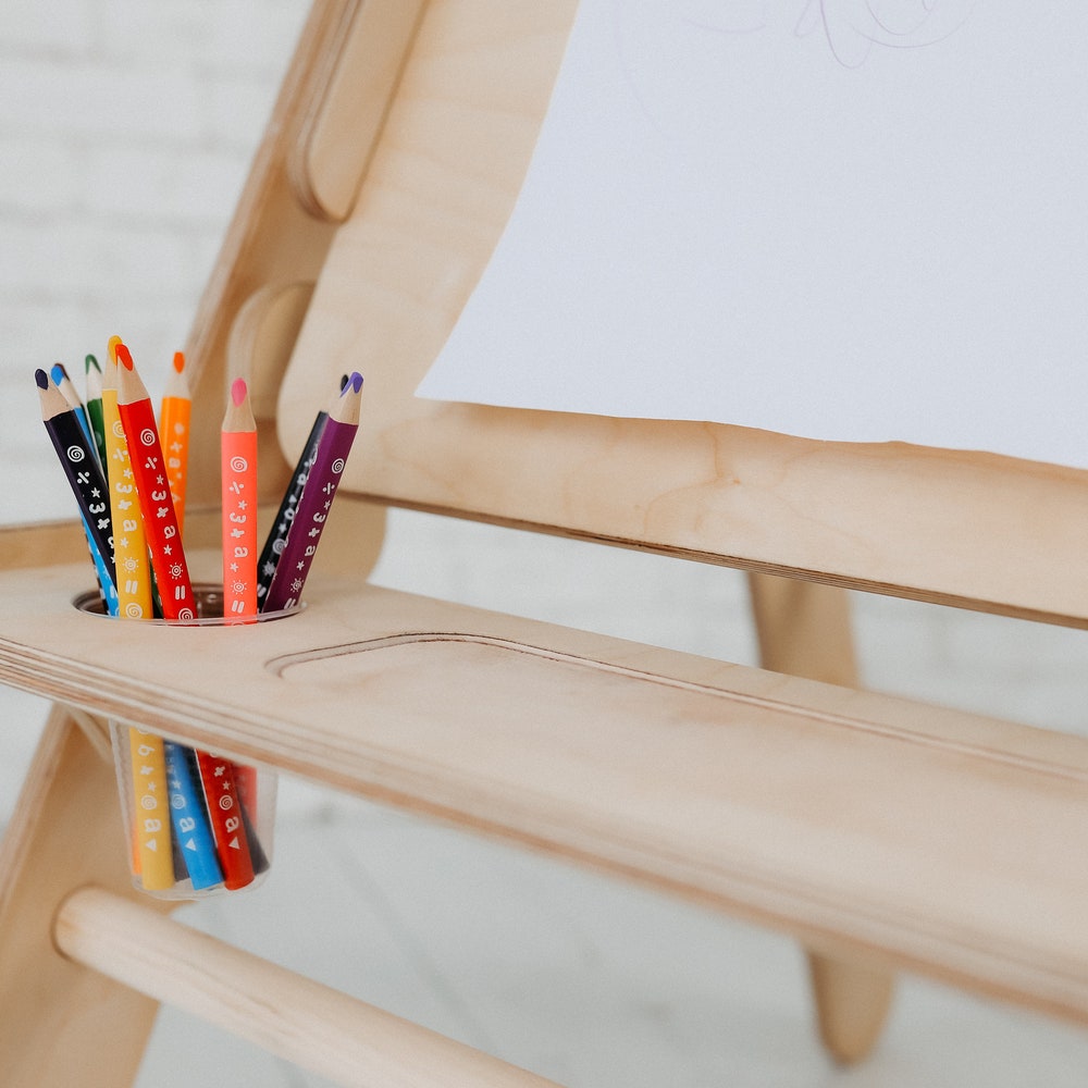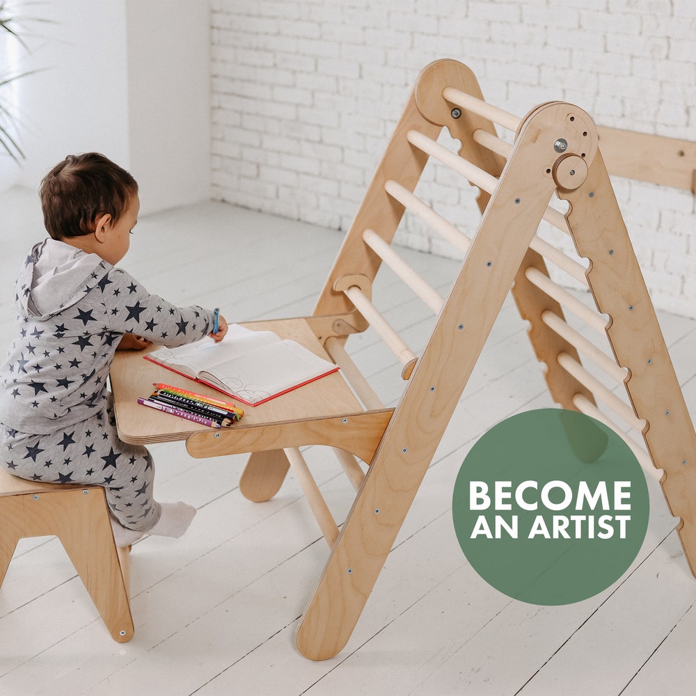 Triangle ladder art addition is a multifunctional art desk for kids. It combines the benefits of an adjustable table and an easel in one product. Kids can use it as a painting or writing desk, but also as a place to watch cartoons or play with toys.