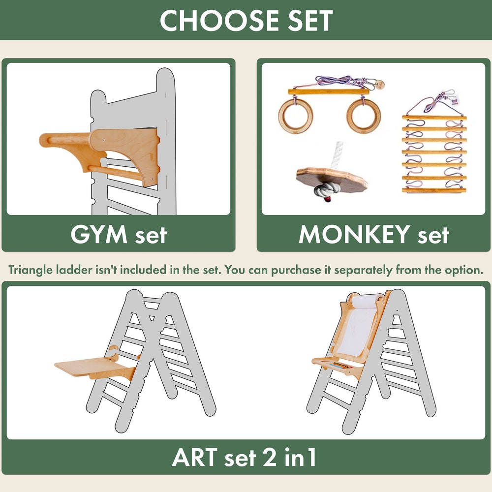 Our Gym addition is sturdy construction made from high-quality wood same as the triangle ladder for long-lasting durability. Triangle ladder gym addition consists of three parts: 2 wall mounts, which you need to attach to your wall, and an upper horizontal bar with help of which your kid can pull up or jump down.
