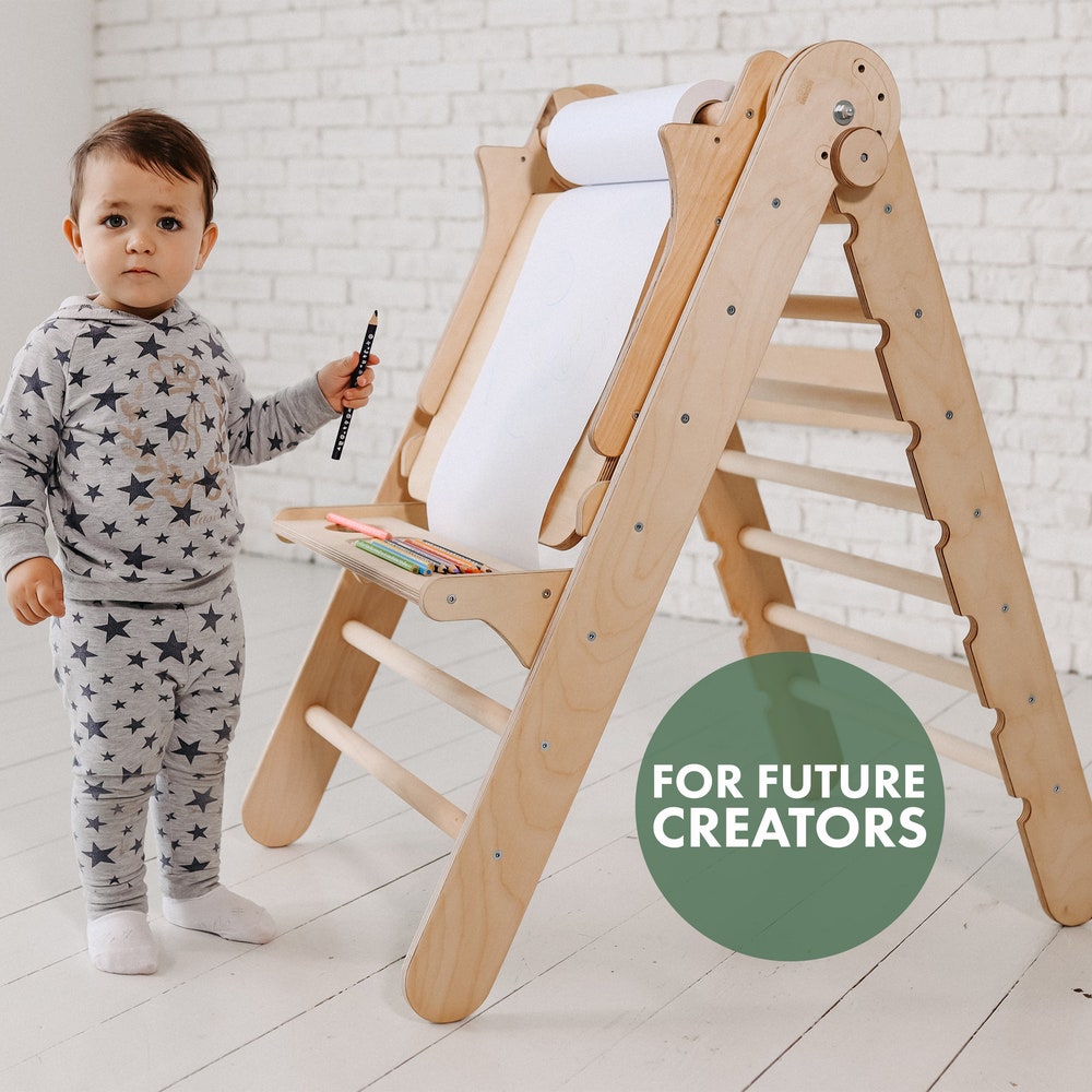 It’s made from 100% eco-friendly materials and it takes up to 20 minutes to assemble. Thanks to the functional design table and easel can be removed in no time when kids decide to switch from painting or writing to climbing.