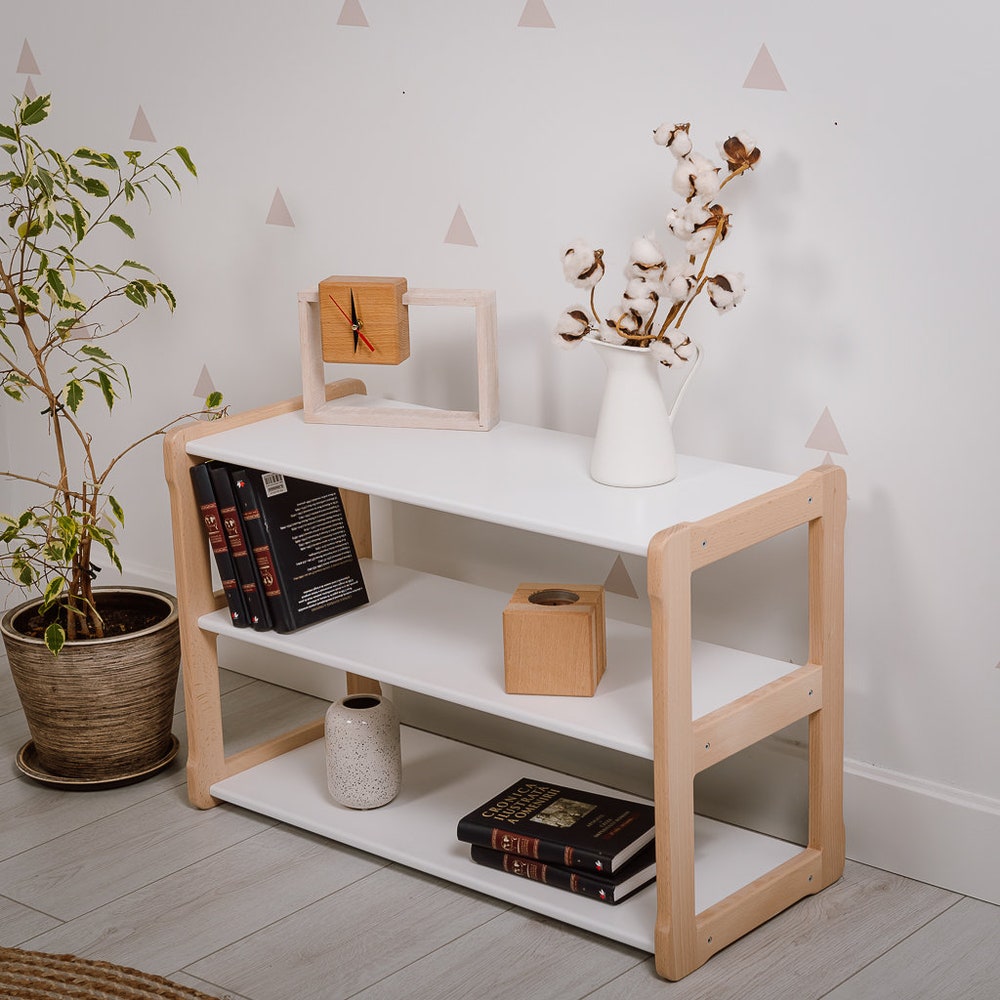 Pretend play with the included tools nurtures fine and gross motor skills, refines tool-handling abilities, enriches vocabulary, and sharpens critical thinking and problem-solving skills. What sets the Toy Kitchen Type B2 apart is its unique back panel, which serves as a creative canvas for your child’s growth journey. As they transition to new horizons, this toy kitchen effortlessly transforms into a captivating MINI shelf for treasured items. Designed for children aged 2 years and older, maintenance is effortless – a gentle wipe with a damp cloth and mild cleaner, followed by a dry wipe, will keep it pristine. To complete the set, you need the Woodjoy Montessori SMALL Shelf—an embodiment of our dedication to crafting multifunctional, Montessori-inspired kids’ furniture. This carefully designed shelf boasts low, open shelves meticulously arranged across three levels, providing the perfect solution for organizing toys and books. This petite yet impactful shelf empowers your child to exercise autonomy by arranging their treasures independently.