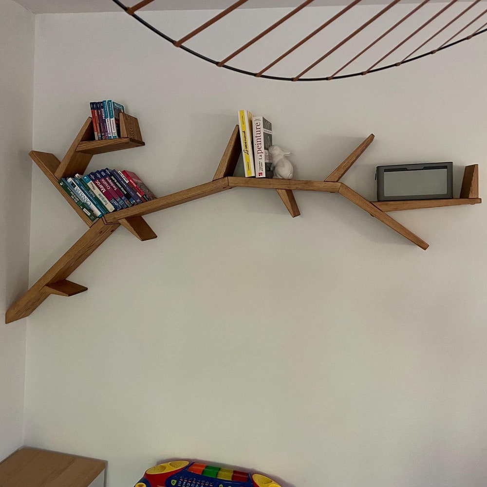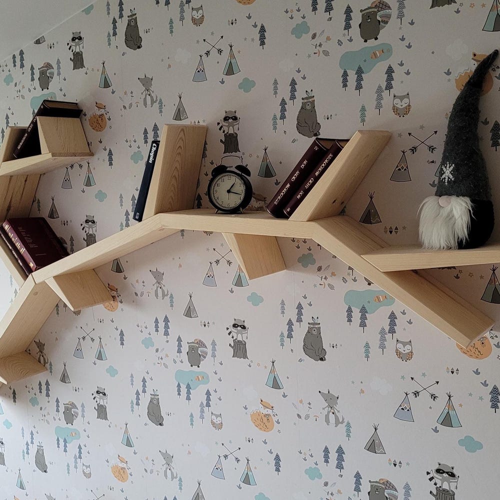 natural wood, floating bookshelf, kidsroom bookshelf, tree branch, nursery room decor, handmade furniture, book stand, handmade, wooden, wood made, boho style, farmhouse style, reclaimed wood, home decor, shelf, bookcase