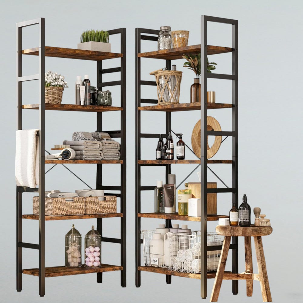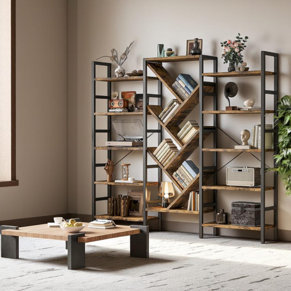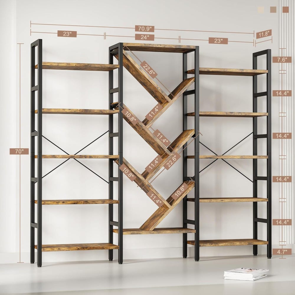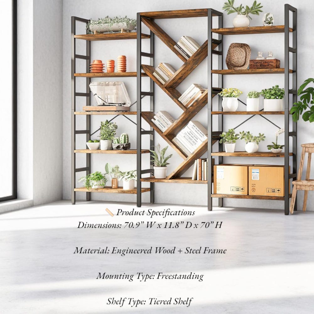 Make a bold statement with this 70×70” triple-wide 5-tier bookshelf, combining modern tree-inspired design with unbeatable functionality. With 17 open shelves and a strong metal frame, it offers a stylish solution for all your display and organization needs—perfect for home offices, bedrooms, living rooms, or any space that needs a touch of rustic-industrial charm.