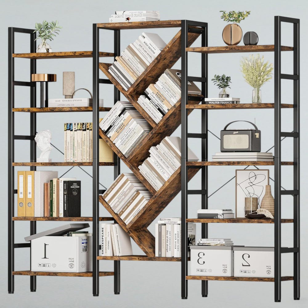 Triple 5-Tier Bookshelf – 70″x70″ Extra Large Industrial Bookcase with 17 Open Shelves | Modern Tree-Inspired Wood & Metal Storage Display Unit for Living Room, Office, or Bedroom (Rustic Brown)