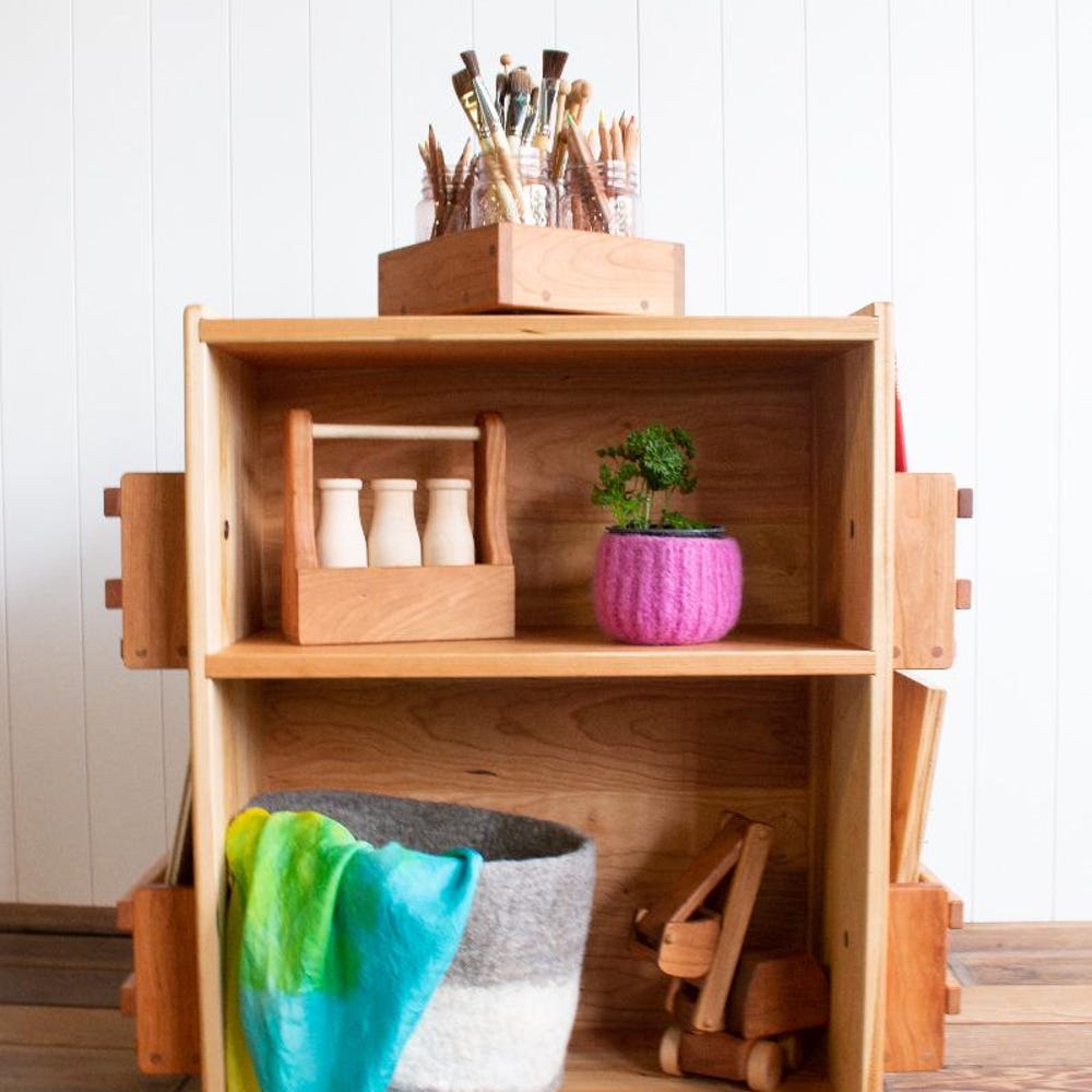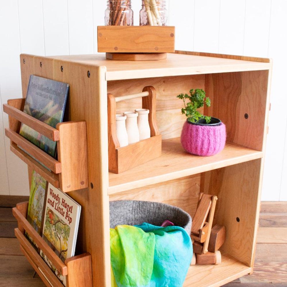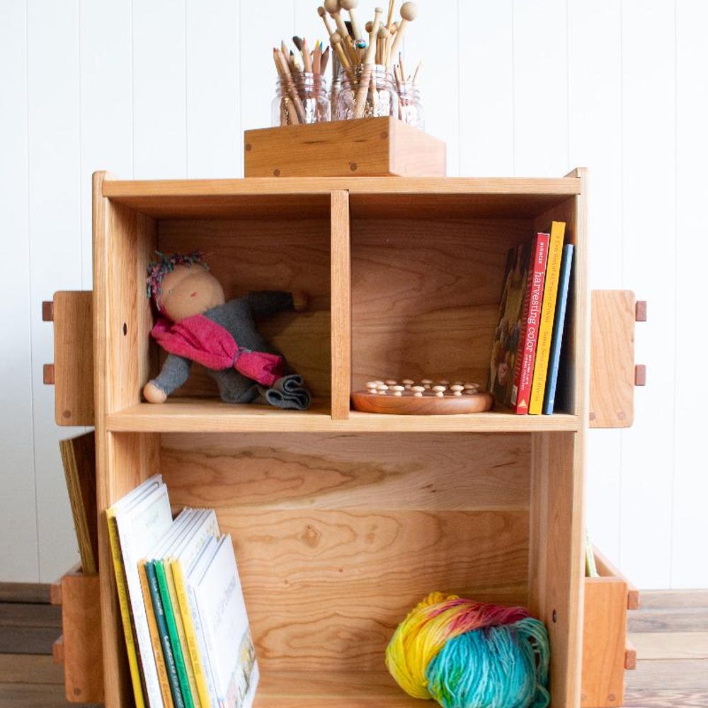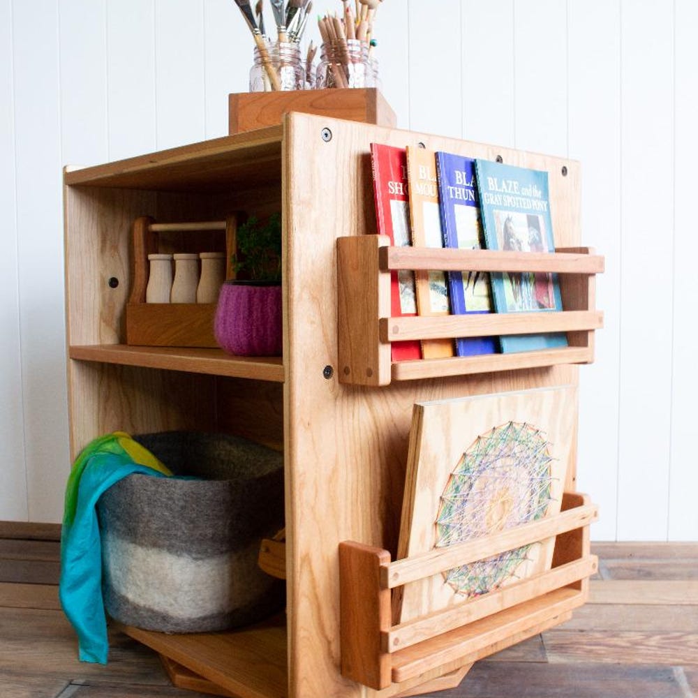 Expand all of your storage needs with this bookshelf that has storage on all sides. Premium turning (lazy susan) bottom allows easy access on any side. Solid cherry wood and with our light beeswax polish finish (organic jojoba oil and beeswax). This offers so much storage it can be used in the center of a […]