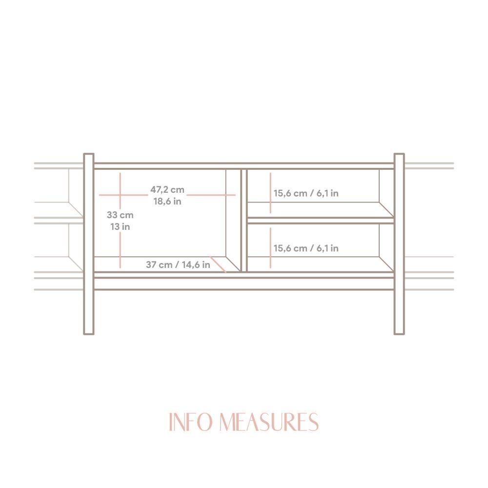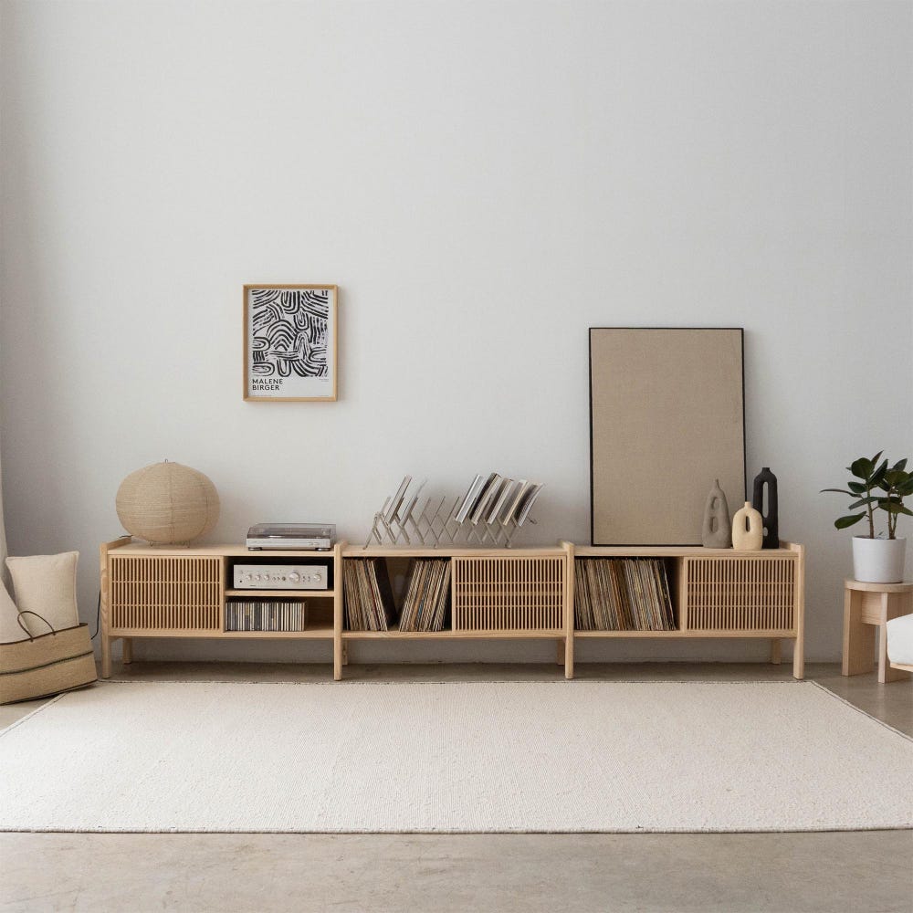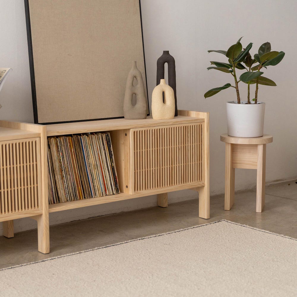 A lovingly crafted manufacturing process in Valencia, Spain, meticulously designed to last. The legs, thicker than the rest of the furniture, provide both visual and structural strength. They feature a machined bottom and a raised top, giving it personality. The large compartments are ideal for storing vinyl records, while the smaller ones can hold CDs or other items. The top of the furniture is perfect for the turntable, another essential element.