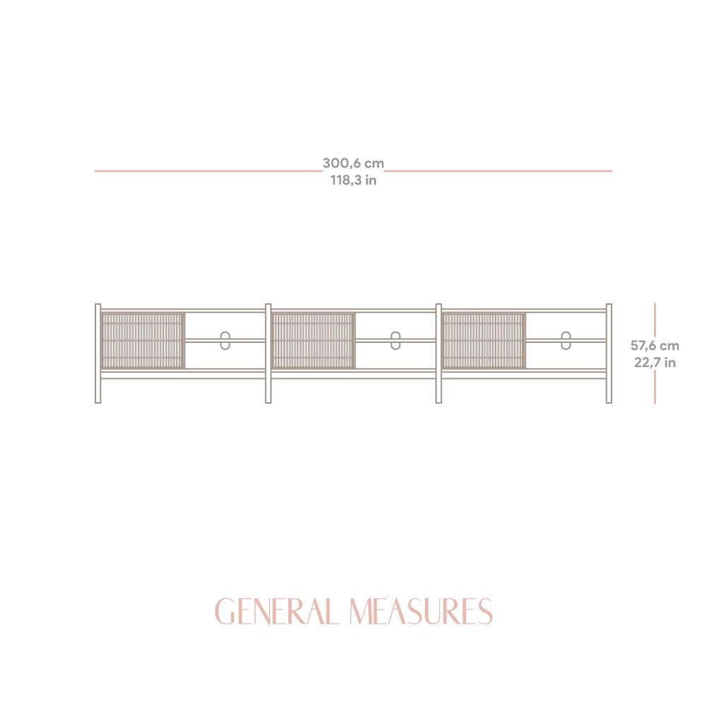 A large 300.6 cm Mendia sideboard, ideal for storing vinyl records, electronics, or decorative items. Handmade and made from solid natural pine wood, a sustainable (PEFC-certified) and durable material. A perfect sideboard for adding style, functionality, and a warm, welcoming look to your home.