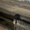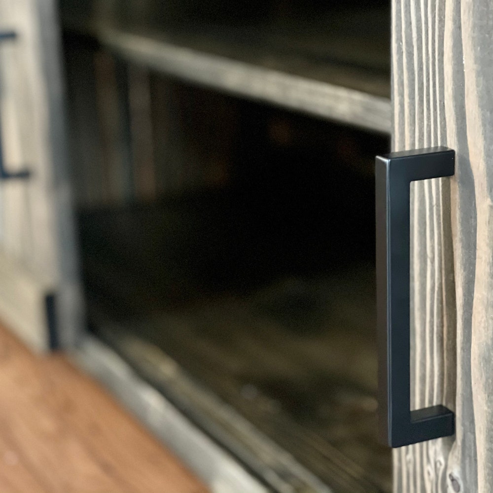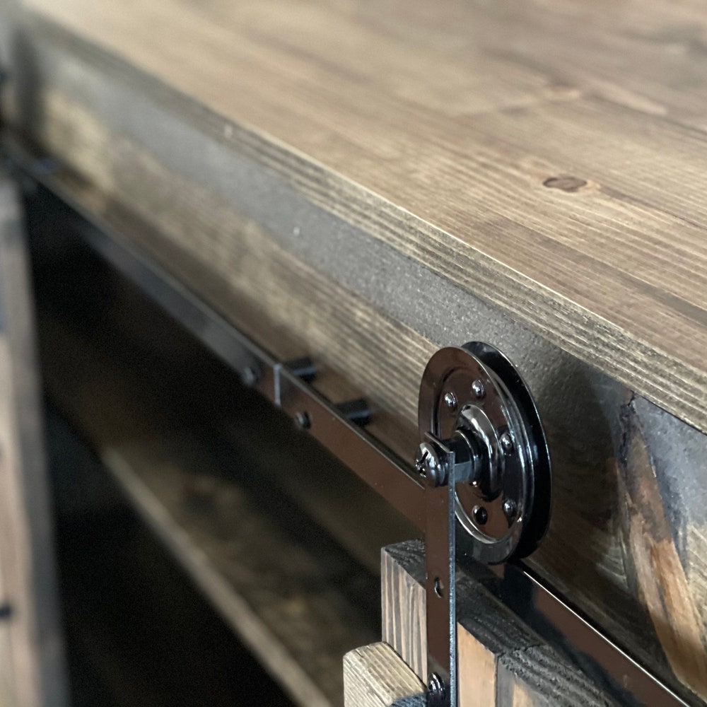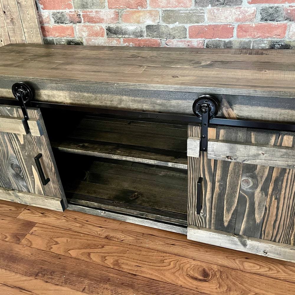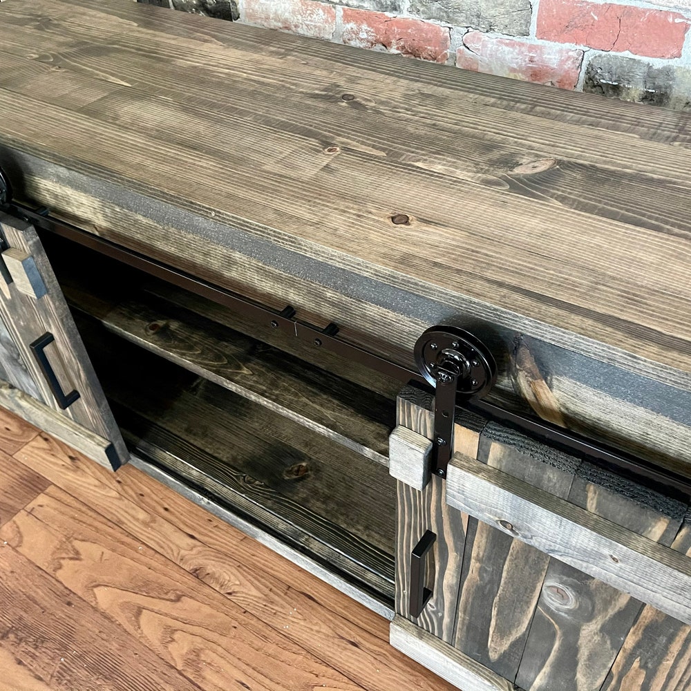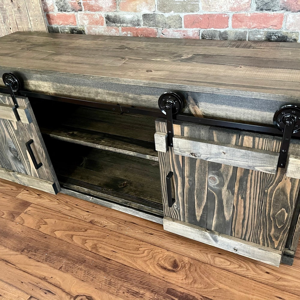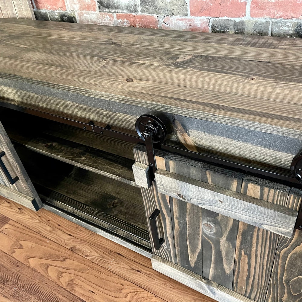 Sliding Barn Doors and metal wheels give this TV Stand its rustic farmhouse appeal.