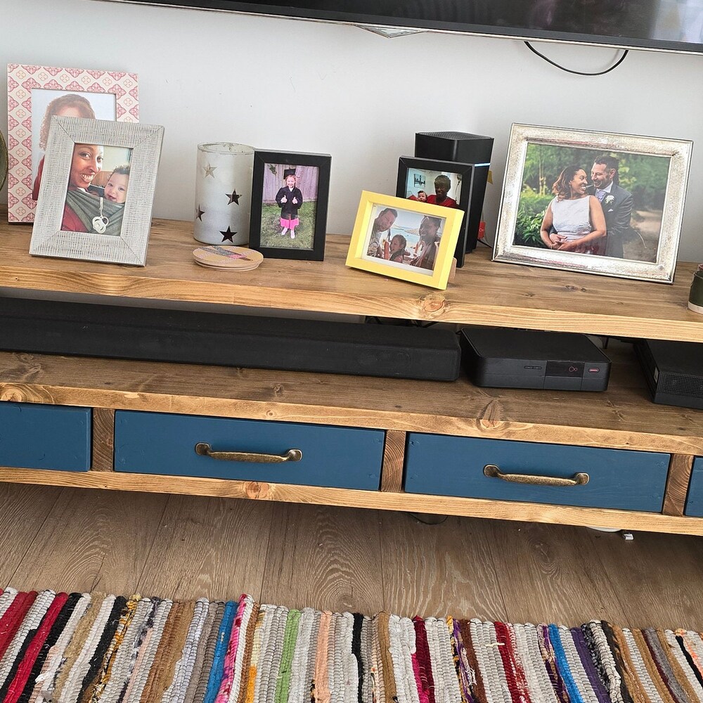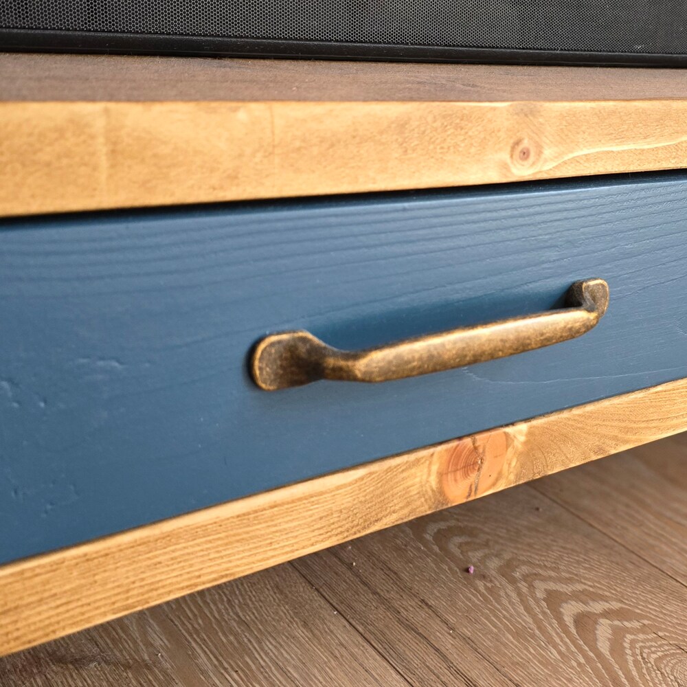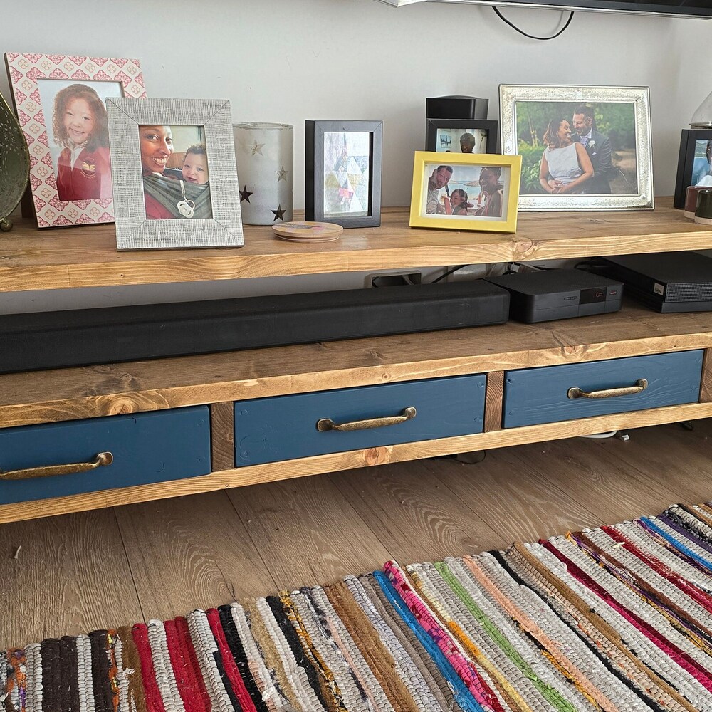 Tv Stand Console Table drawers organiser brass handles storage cabinet shelving unit photos display media centre industrial entertainment