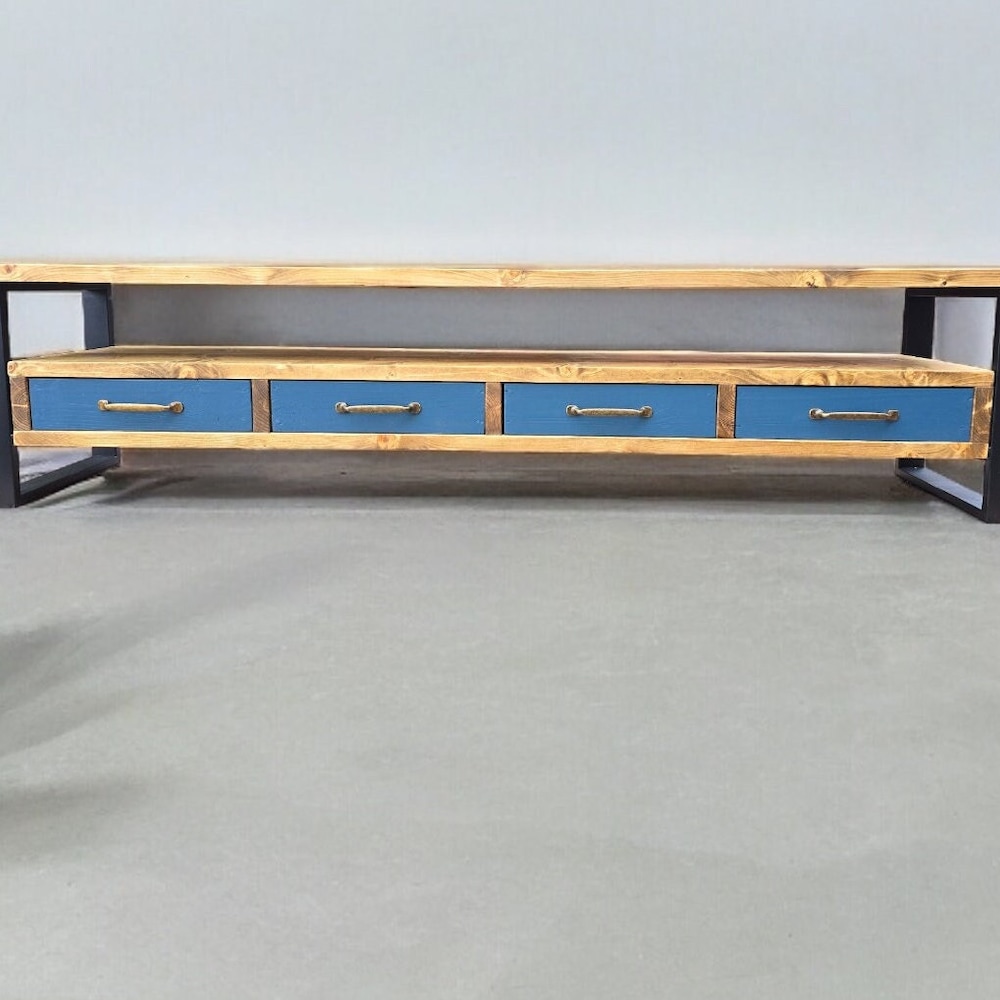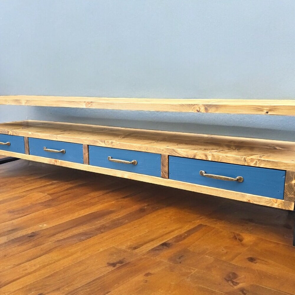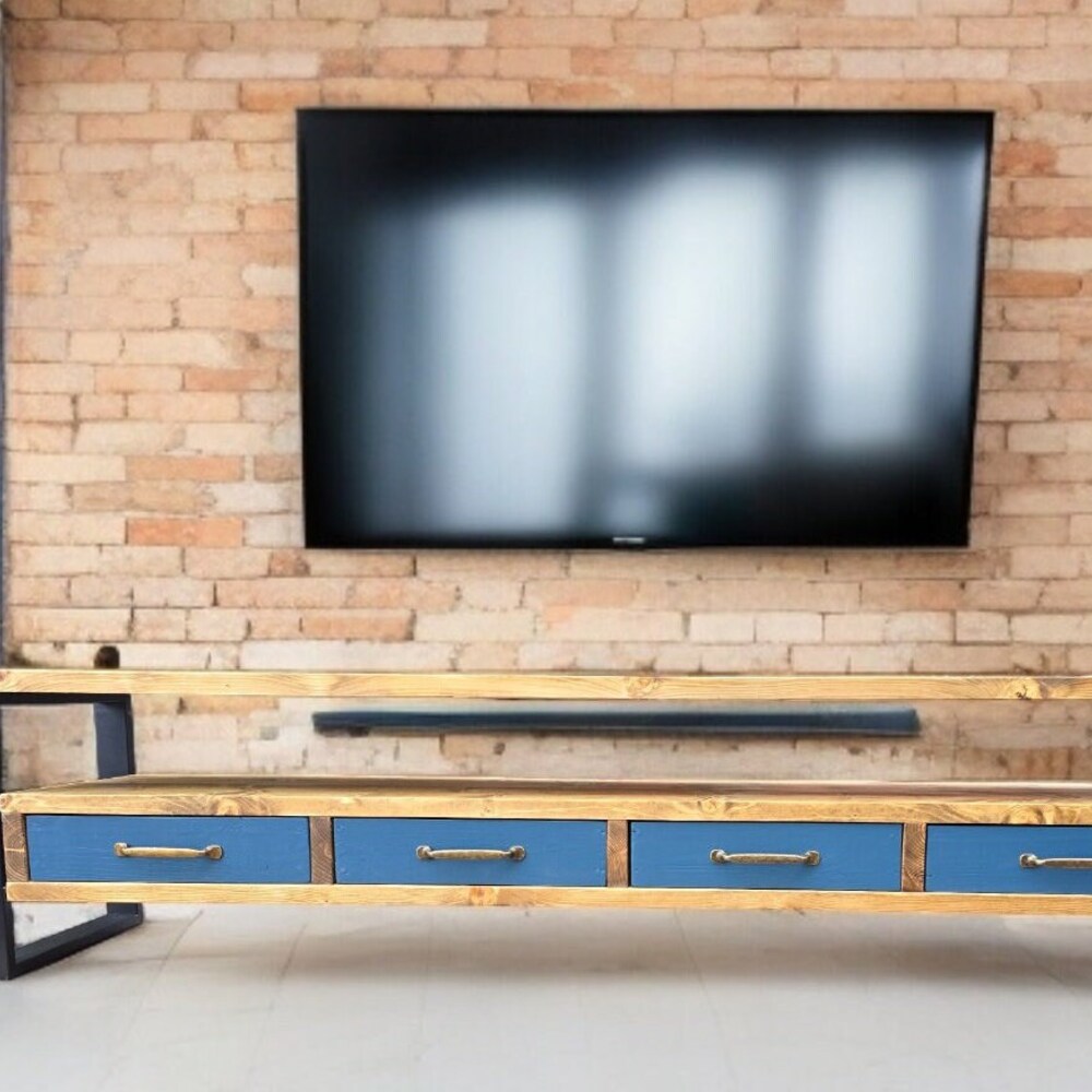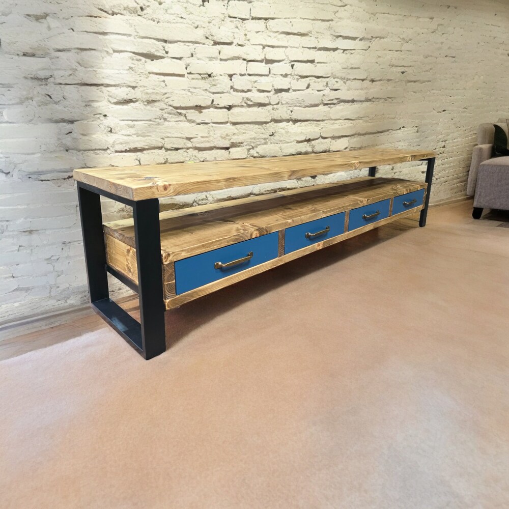 Tv Stand Console Table drawers organiser brass handles storage cabinet shelving unit photos display media centre industrial entertainment