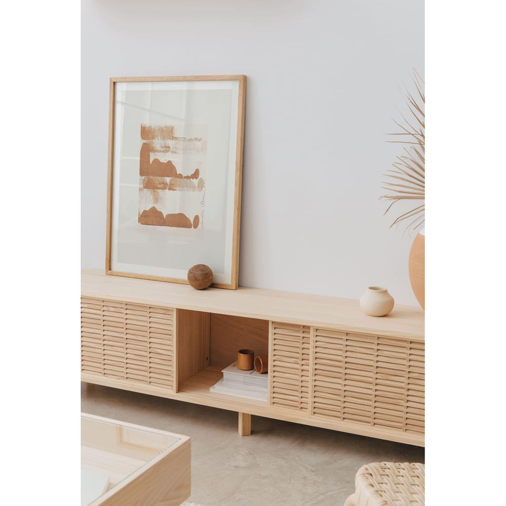 Introducing the Mitjana TV cabinet, a beautiful and functional piece of handmade furniture made of natural solid pine wood. Quality materials with PEFC certification to ensure sustainability and durability. This elegant media cabinet features three sliding doors made from our beautiful mallorquina and a design that effortlessly blends Scandinavian style with a timeless, Mediterranean aesthetic.