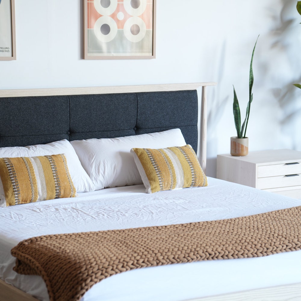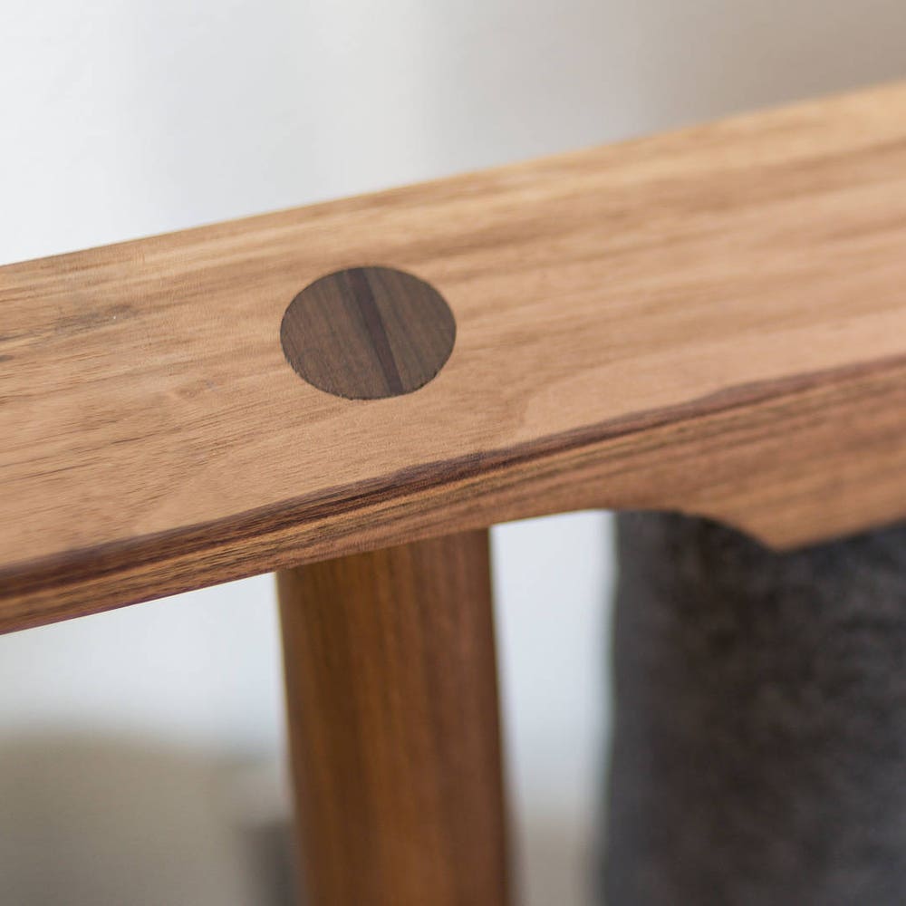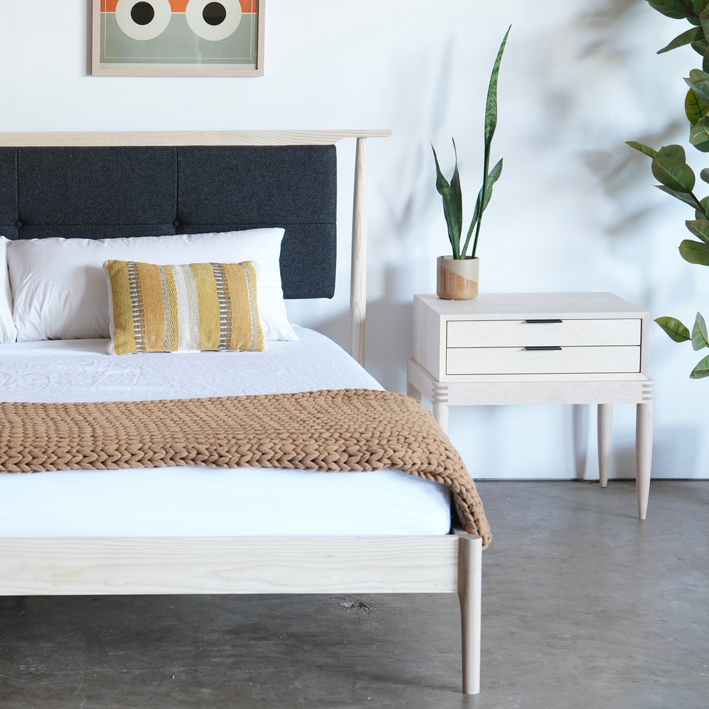 Though delicate in design, this bed is remarkably sturdy and stout. The design goal was to have a bed that is both simple in appearance and that gives a strong presence. To have the headboard extend 6″ on either side past the footprint of the rest of the bed frame lends to making a statement in the room without feeling bulky.