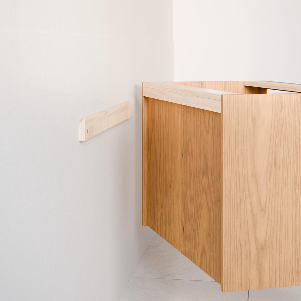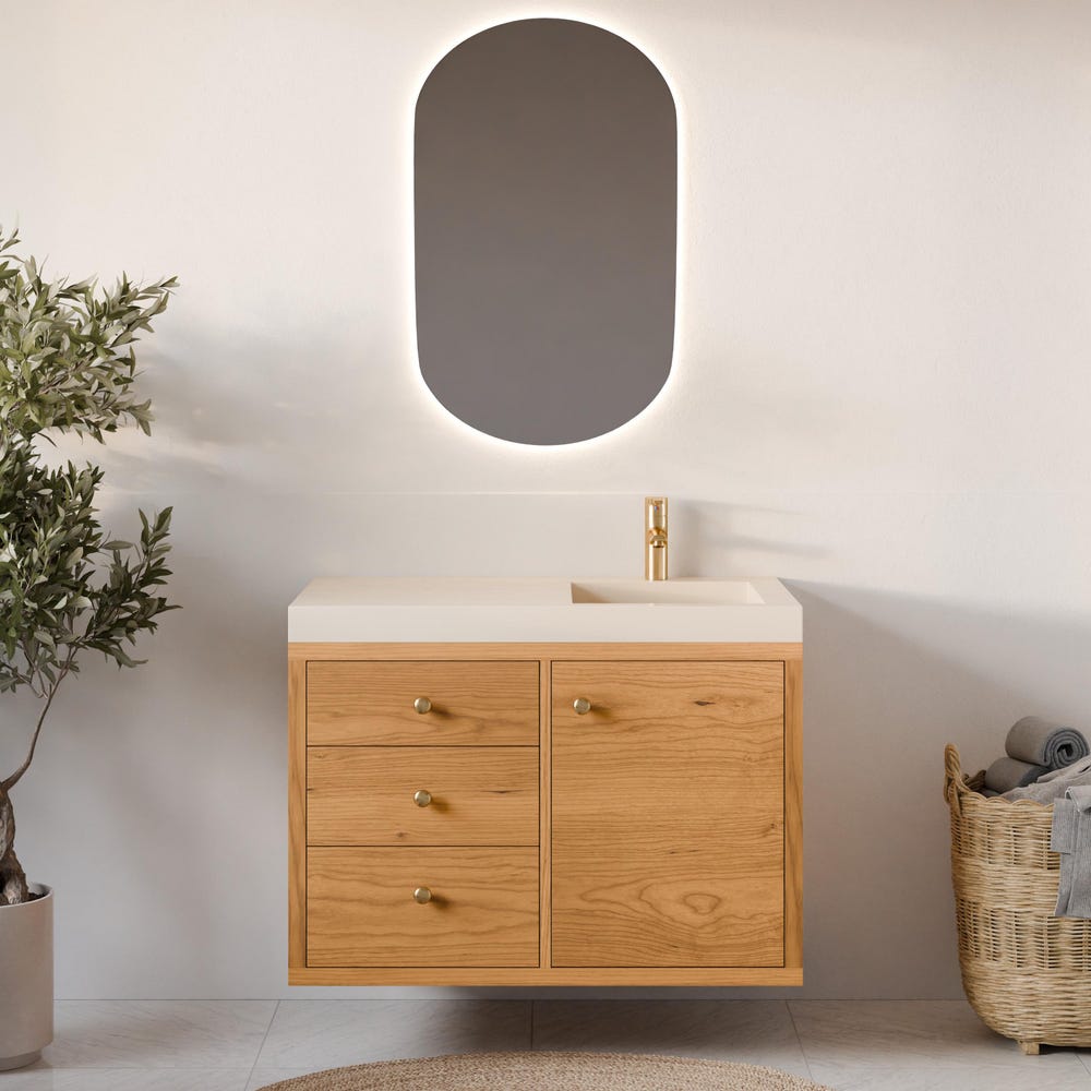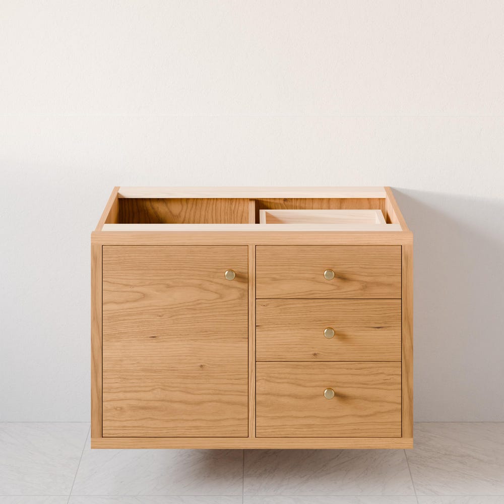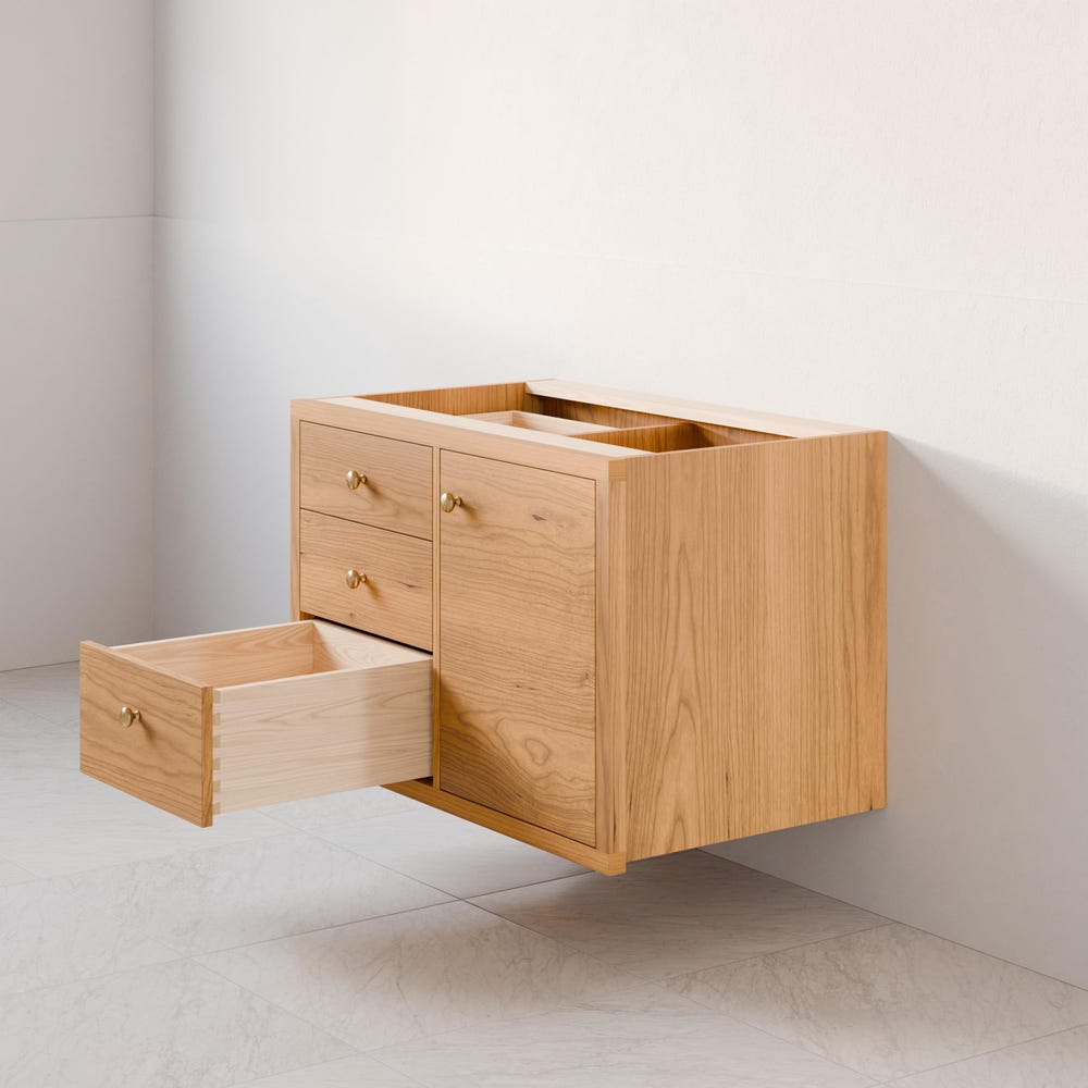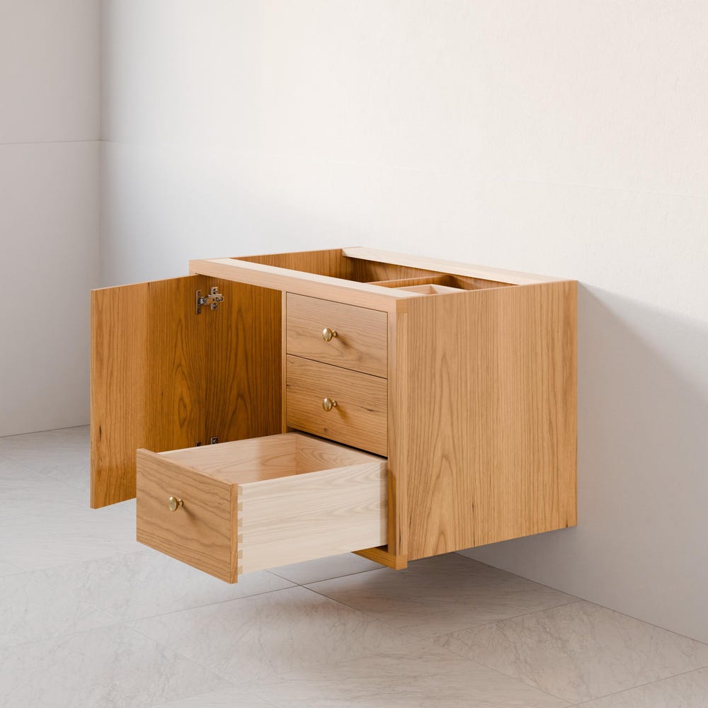 Our floating vanity is handmade in our Portland shop from the highest quality hardwood veneer with real Cherry facing. We use premium 3/4” stock with a sturdy 1/2” back panel which is easily cut for plumbing at the time of install. The face frame is solid Cherry with edge banded veneer doors and drawers. Door is soft-close hinged. One 3/4” adjustable shelf behind the doors.
