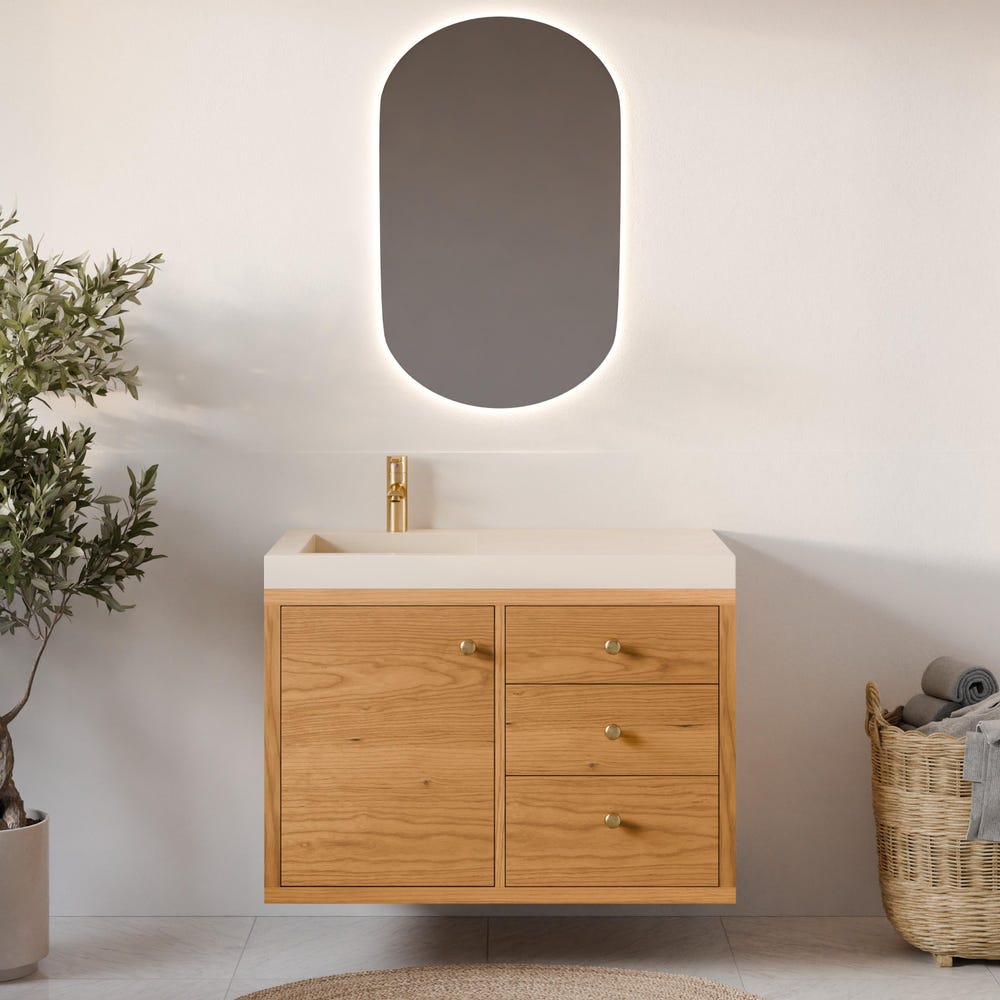 Vanities are finished with low VOC Hard Wax Oil for a durable, water-resistant satin sheen. We do not use stain— only clear oil for a natural color. Variations in color and grain should be expected from real wood.