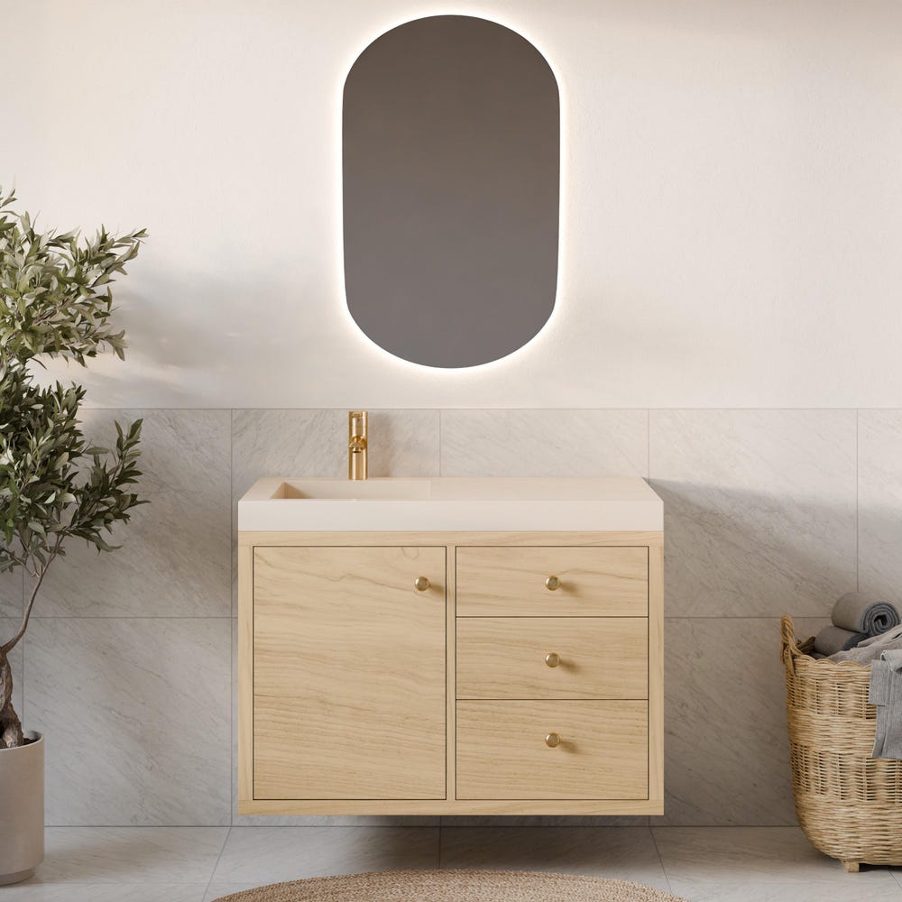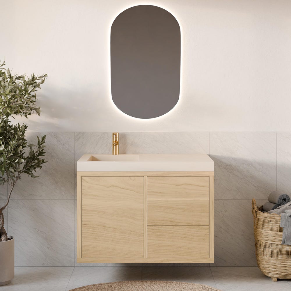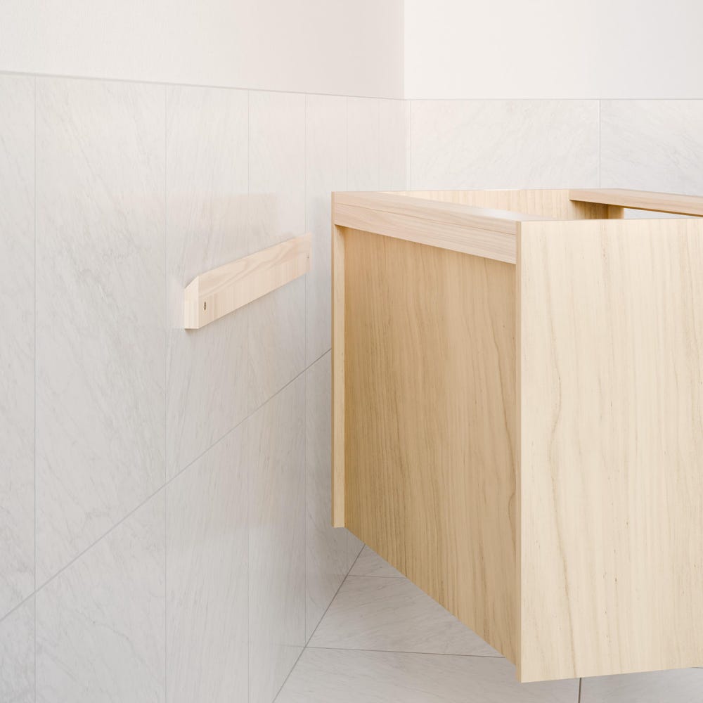 Vanities are finished with low VOC Hard Wax Oil for a durable, water-resistant satin sheen. We do not use stain— only clear oil for a natural color. Variations in color and grain should be expected from real wood.