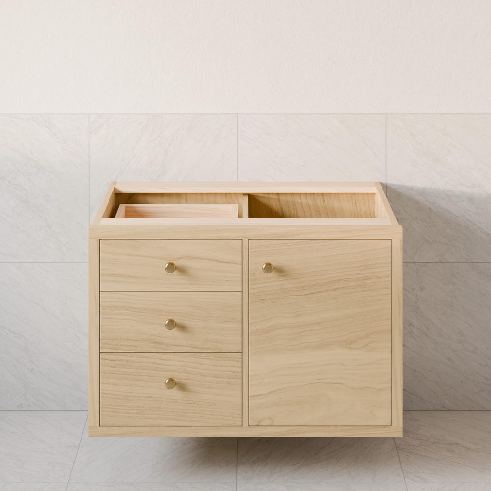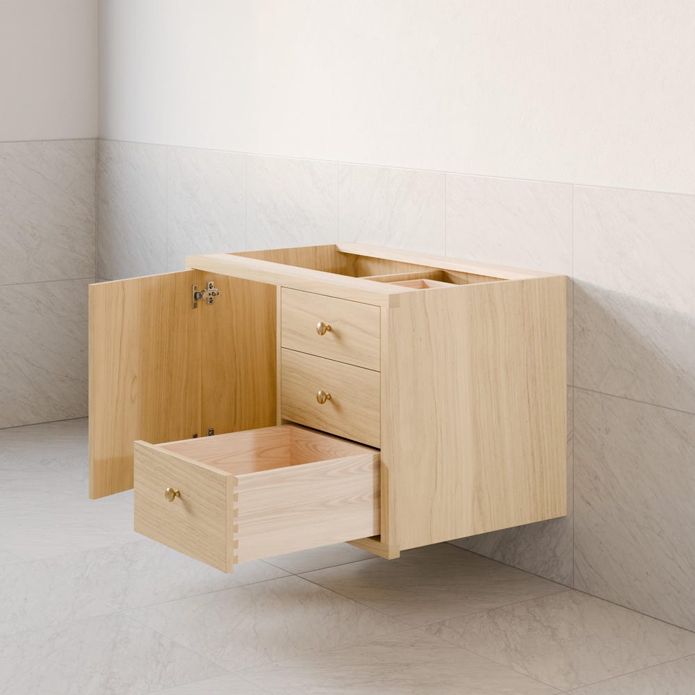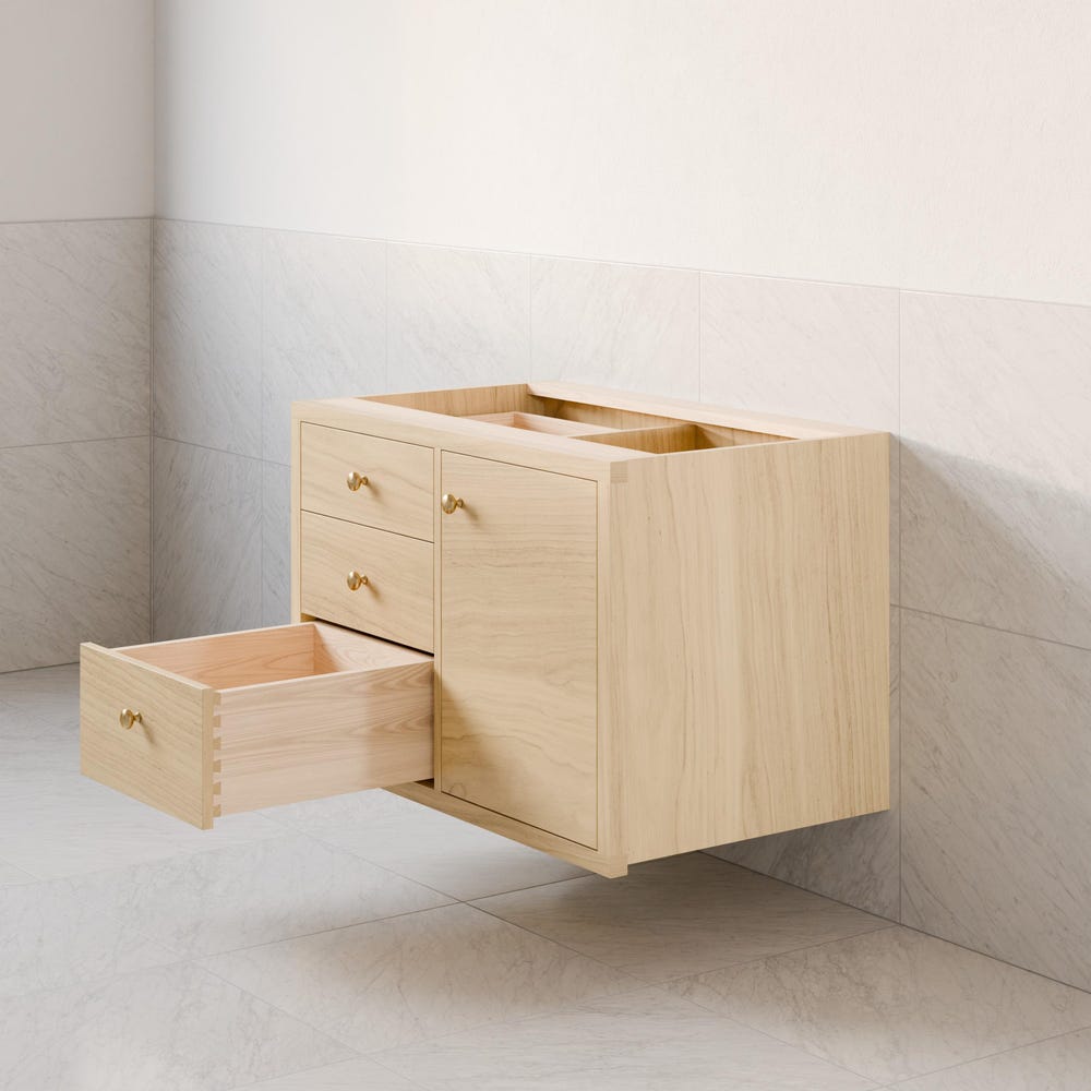 Our floating vanity is handmade in our Portland shop from the highest quality hardwood veneer with real Maple facing. We use premium 3/4” stock with a sturdy 1/2” back panel which is easily cut for plumbing at the time of install. The face frame is solid Maple with edge banded veneer doors and drawers. Door is soft-close hinged. One 3/4” adjustable shelf behind the doors.