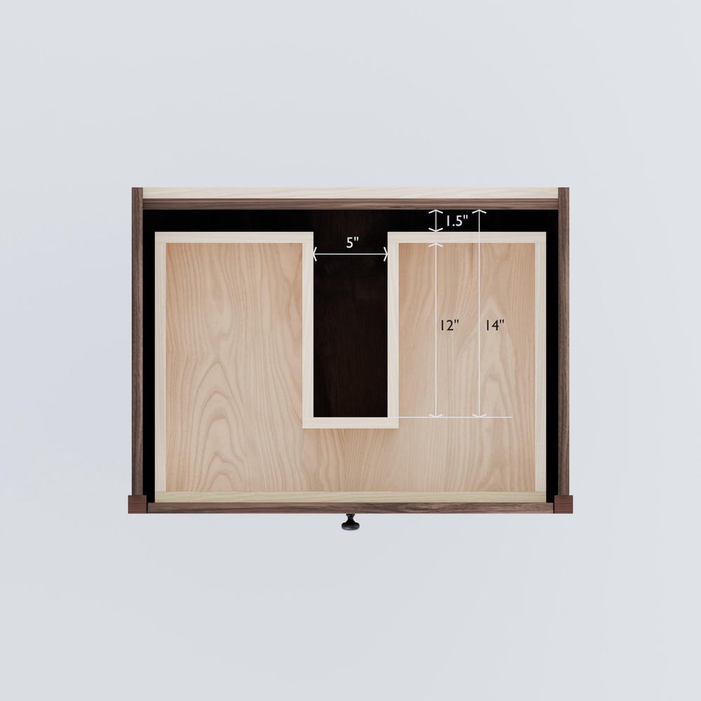 Standard plumbing cutout can be modified for your unique set-up if needed. See images for standard cut-out. Top drawer is shorter to allow for integrated counter/sink combos.