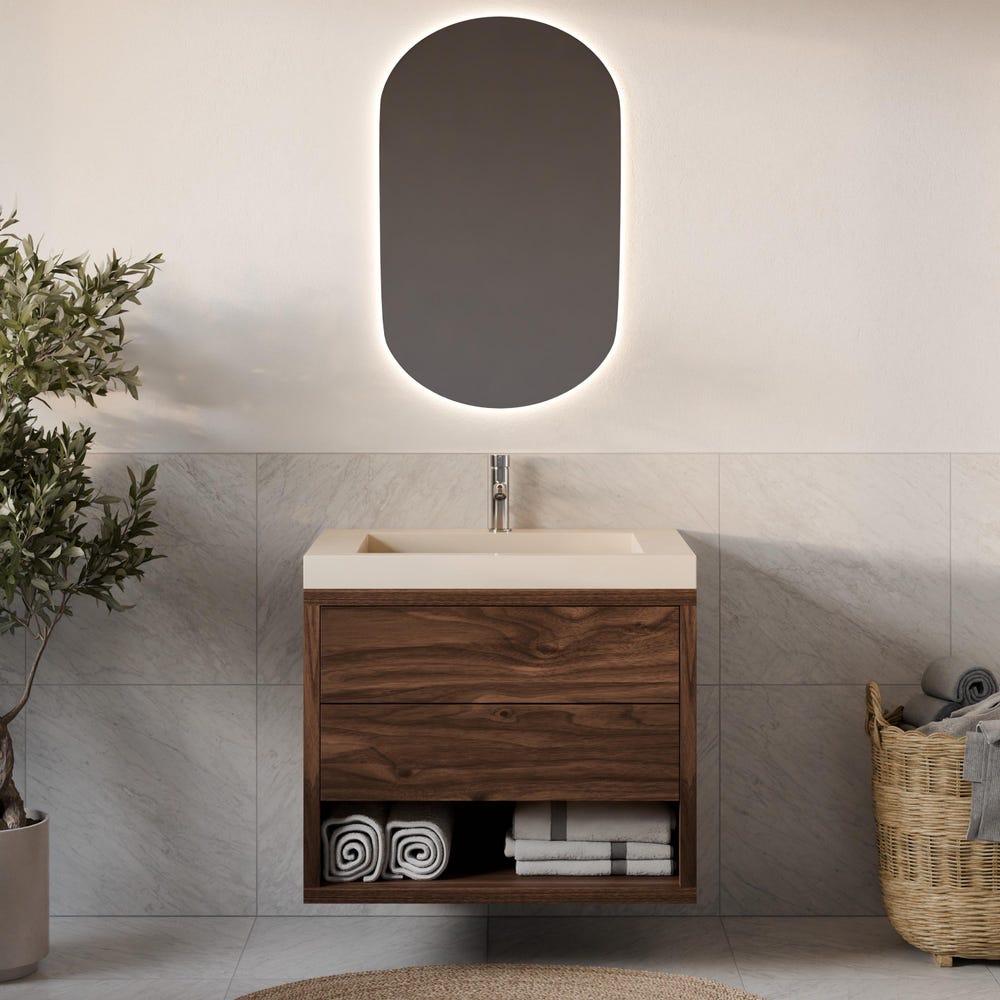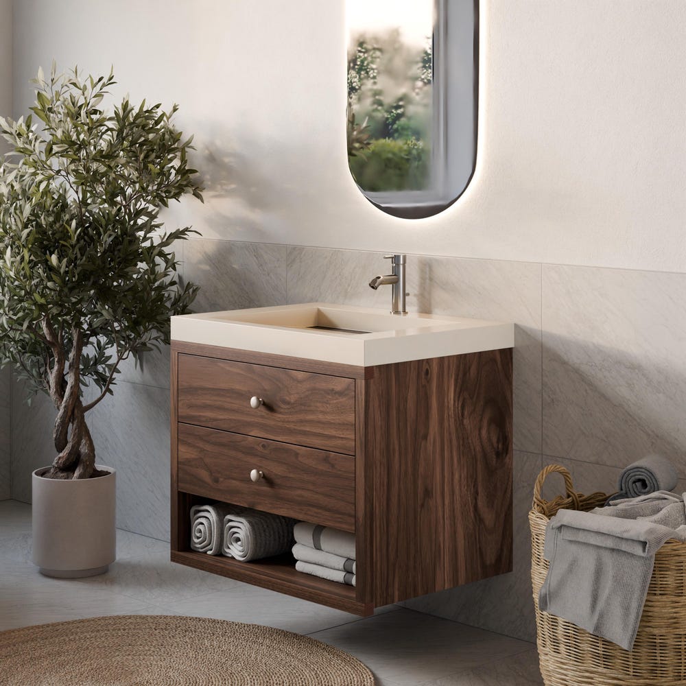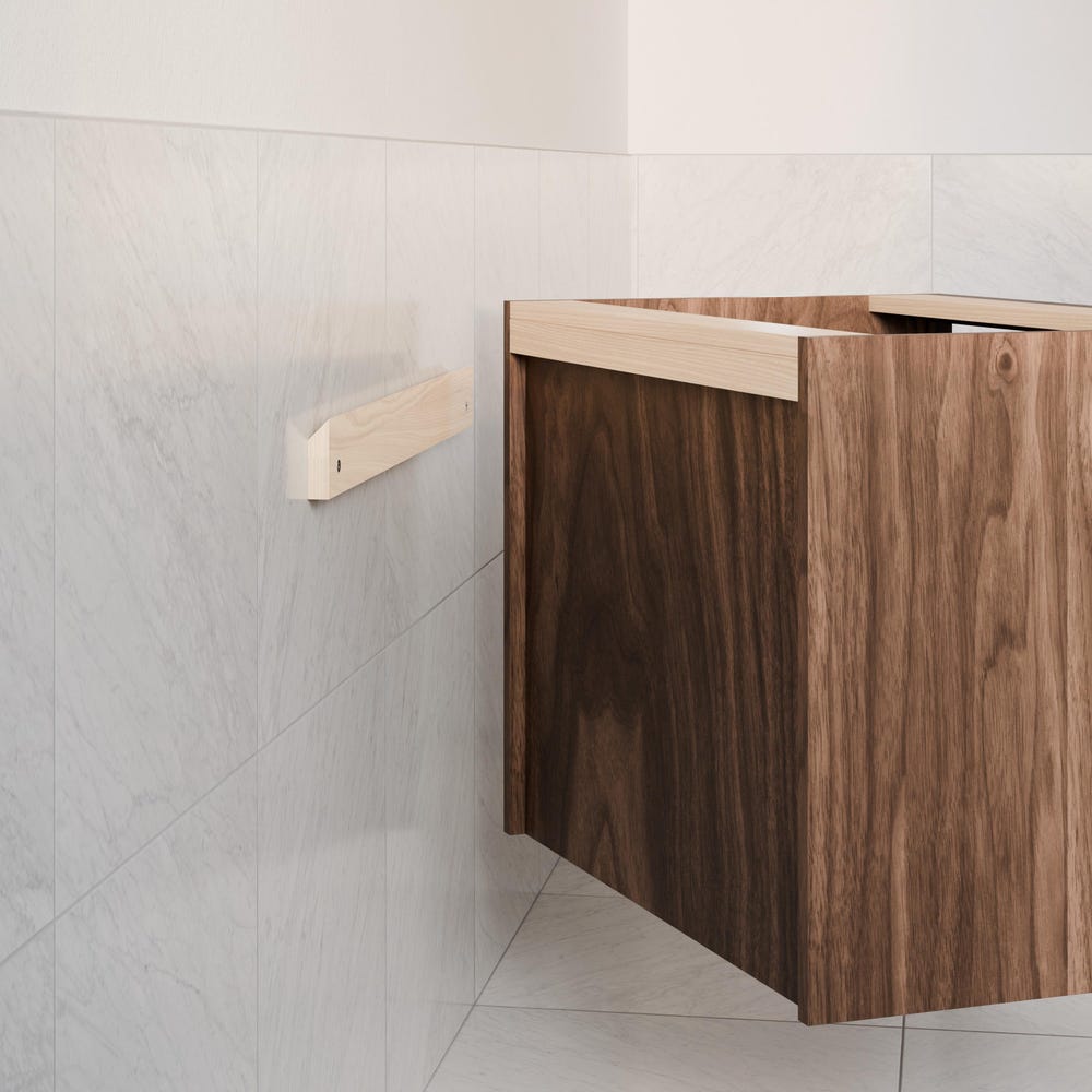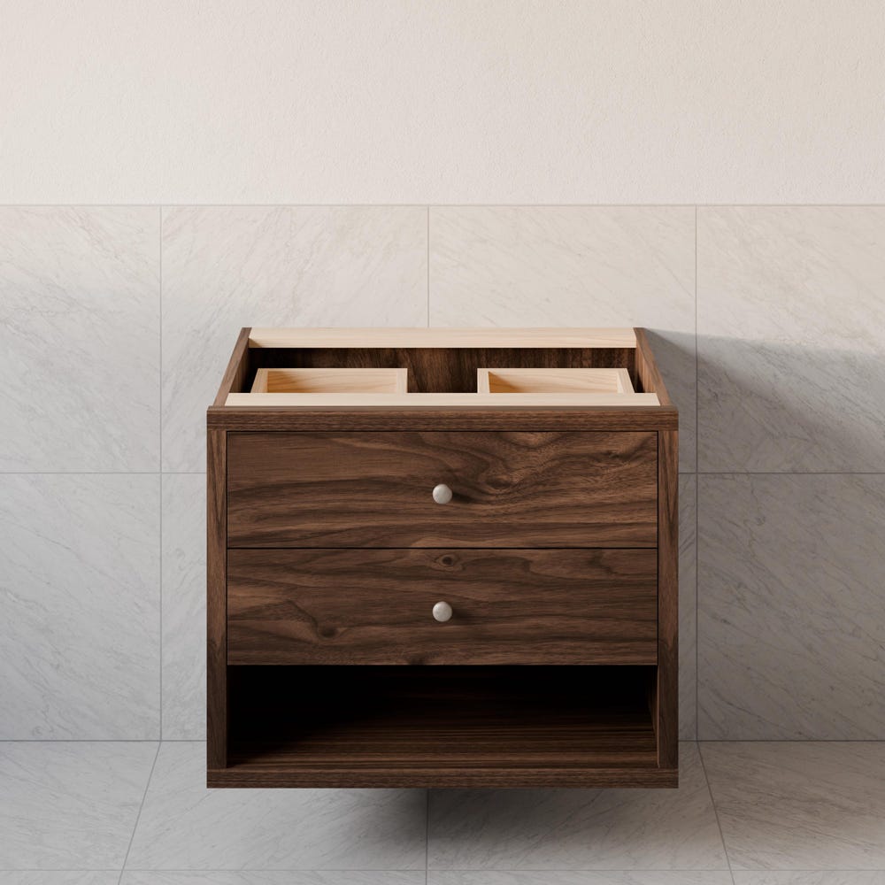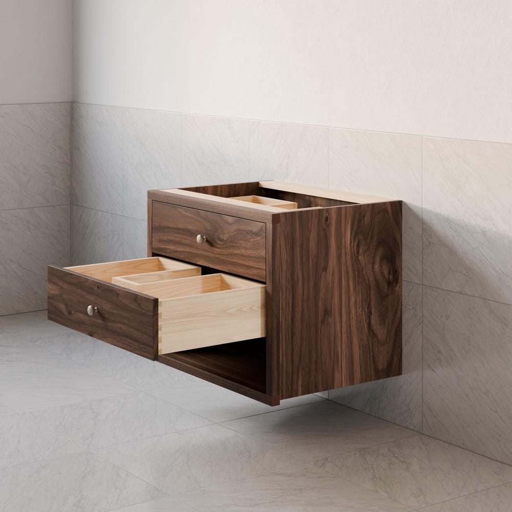Our floating vanity is handmade in our Portland shop from the highest quality hardwood veneer. We use 3/4” A1 Cabinet Grade Veneer with a sturdy 1/2” back panel which is easily cut for plumbing at the time of install. The face frame is solid Walnut with edge banded veneer drawer fronts.